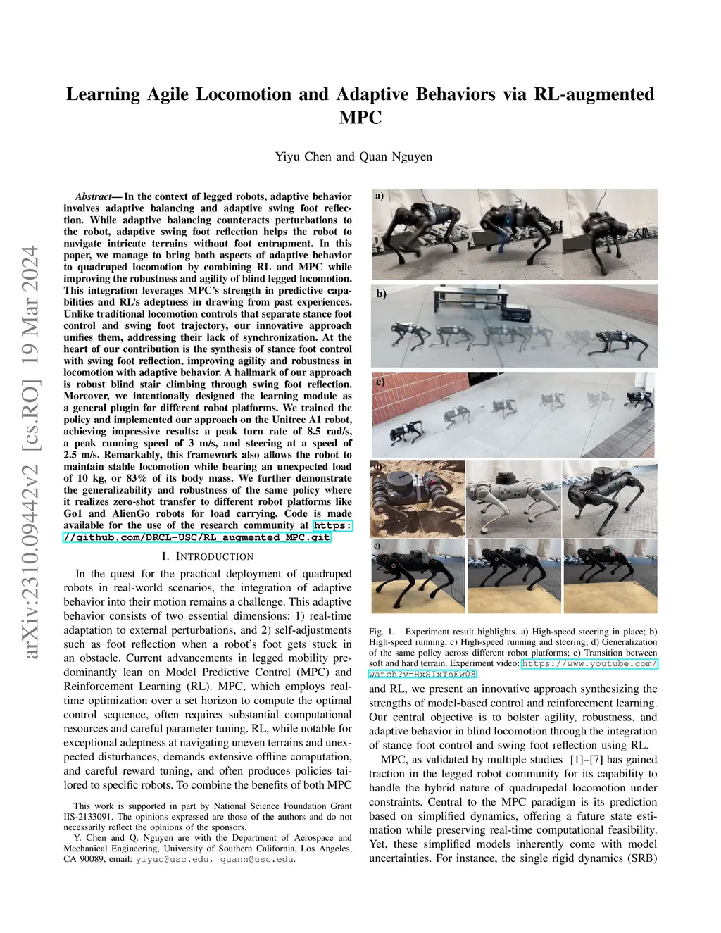 In the context of legged robots, adaptive behavior involves adaptive balancing and adaptive swing foot reflection. While adaptive balancing counteracts perturbations to the robot, adaptive swing foot reflection helps the robot to navigate intricate terrains without foot entrapment. In this paper, we manage to bring both aspects of adaptive behavior to quadruped locomotion by combining RL and MPC while improving the robustness and agility of blind legged locomotion. This integration leverages MPC's strength in predictive capabilities and RL's adeptness in drawing from past experiences. Unlike traditional locomotion controls that separate stance foot control and swing foot trajectory, our innovative approach unifies them, addressing their lack of synchronization. At the heart of our contribution is the synthesis of stance foot control with swing foot reflection, improving agility and robustness in locomotion with adaptive behavior. A hallmark of our approach is robust blind stair climbing through swing foot reflection. Moreover, we intentionally designed the learning module as a general plugin for different robot platforms. We trained the policy and implemented our approach on the Unitree A1 robot, achieving impressive results: a peak turn rate of 8.5 rad/s, a peak running speed of 3 m/s, and steering at a speed of 2.5 m/s. Remarkably, this framework also allows the robot to maintain stable locomotion while bearing an unexpected load of 10 kg, or 83\% of its body mass. We further demonstrate the generalizability and robustness of the same policy where it realizes zero-shot transfer to different robot platforms like Go1 and AlienGo robots for load carrying. Code is made available for the use of the research community at https://github.com/DRCL-USC/RL_augmented_MPC.git