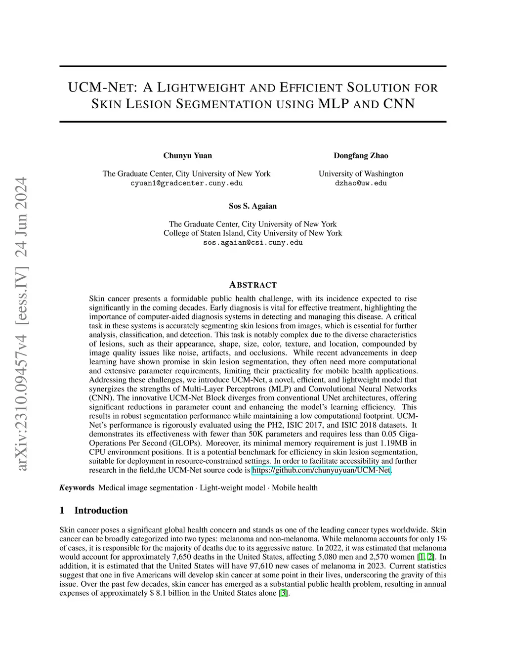 Skin cancer poses a significant public health challenge, necessitating efficient diagnostic tools. We introduce UCM-Net, a novel skin lesion segmentation model combining Multi-Layer Perceptrons (MLP) and Convolutional Neural Networks (CNN). This lightweight, efficient architecture, deviating from traditional UNet designs, dramatically reduces computational demands, making it ideal for mobile health applications. Evaluated on PH2, ISIC 2017, and ISIC 2018 datasets, UCM-Net demonstrates robust performance with fewer than 50KB parameters and requires less than 0.05 Giga Operations Per Second (GLOPs). Moreover, its minimal memory requirement is just 1.19MB in CPU environment positions. It is a potential benchmark for efficiency in skin lesion segmentation, suitable for deployment in resource-constrained settings. In order to facilitate accessibility and further research in the field, the UCM-Net source code is https://github.com/chunyuyuan/UCM-Net.