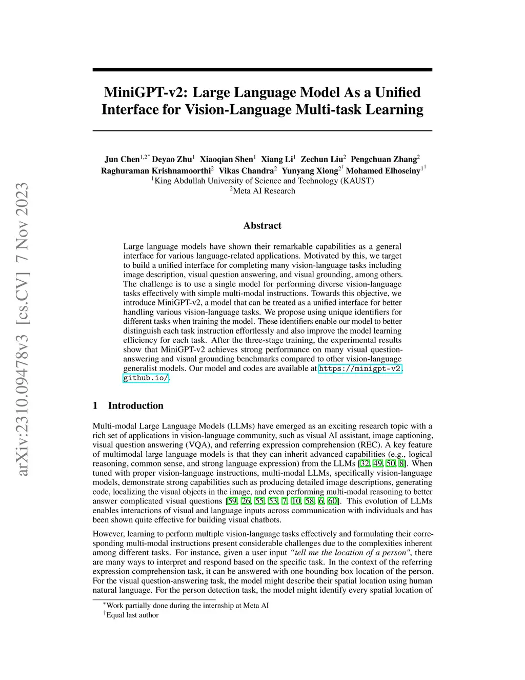 Large language models have shown their remarkable capabilities as a general interface for various language-related applications. Motivated by this, we target to build a unified interface for completing many vision-language tasks including image description, visual question answering, and visual grounding, among others. The challenge is to use a single model for performing diverse vision-language tasks effectively with simple multi-modal instructions. Towards this objective, we introduce MiniGPT-v2, a model that can be treated as a unified interface for better handling various vision-language tasks. We propose using unique identifiers for different tasks when training the model. These identifiers enable our model to better distinguish each task instruction effortlessly and also improve the model learning efficiency for each task. After the three-stage training, the experimental results show that MiniGPT-v2 achieves strong performance on many visual question-answering and visual grounding benchmarks compared to other vision-language generalist models. Our model and codes are available at https://minigpt-v2.github.io/