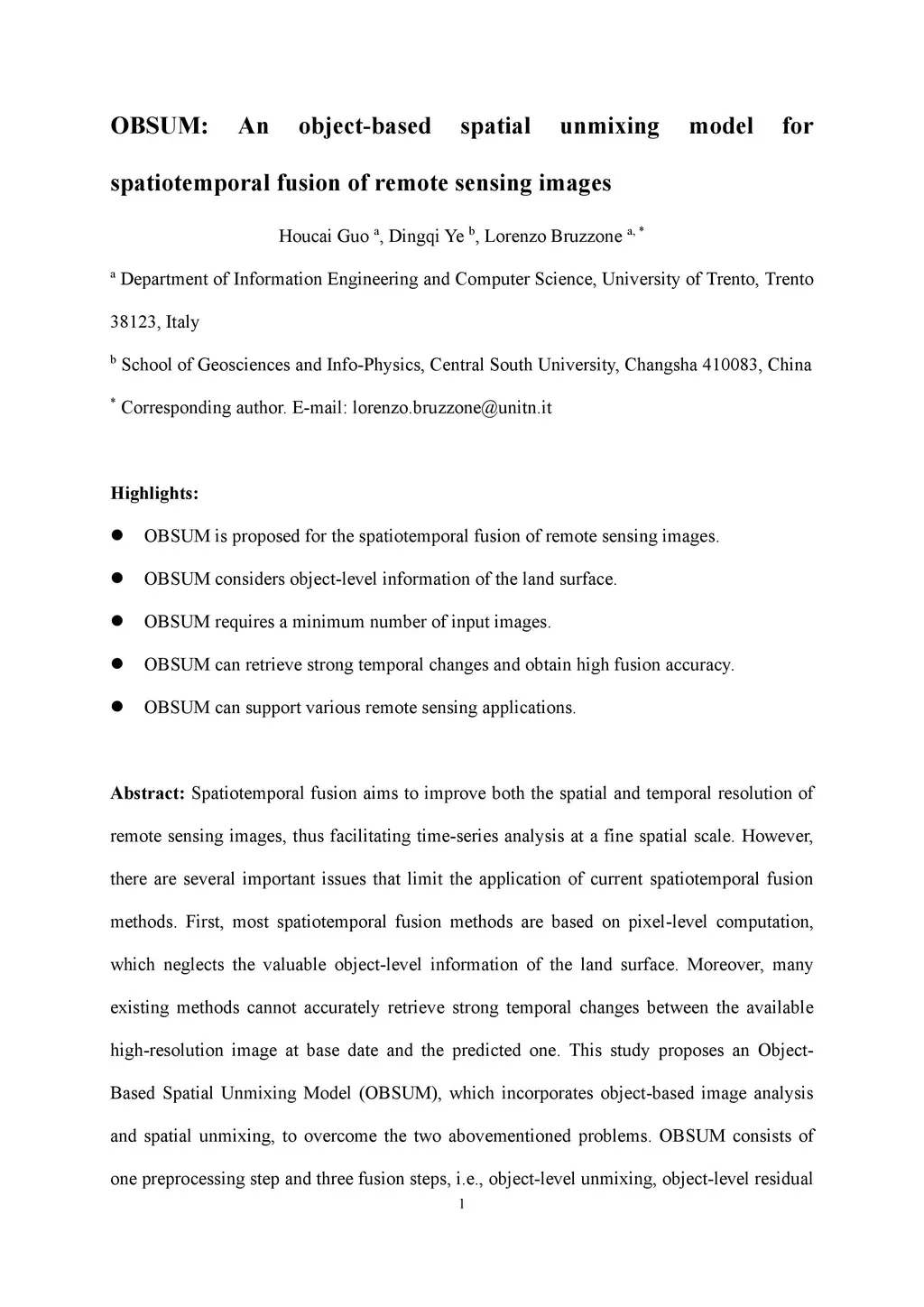 OBSUM: An object-based spatial unmixing model for spatiotemporal fusion