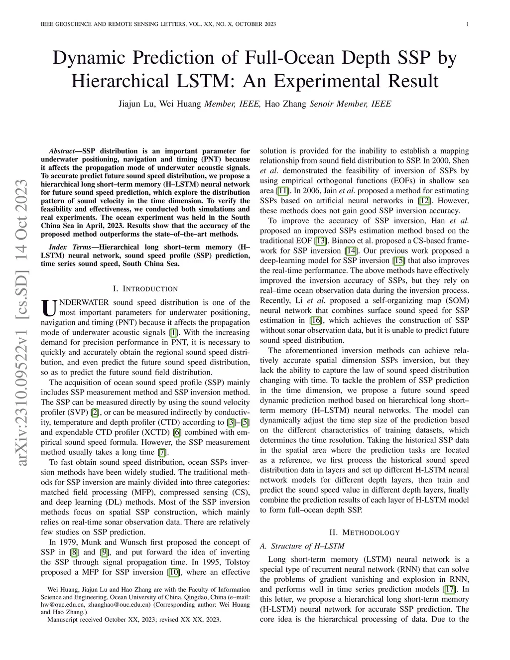 SSP distribution is an important parameter for underwater positioning, navigation and timing (PNT) because it affects the propagation mode of underwater acoustic signals. To accurate predict future sound speed distribution, we propose a hierarchical long short--term memory (H--LSTM) neural network for future sound speed prediction, which explore the distribution pattern of sound velocity in the time dimension. To verify the feasibility and effectiveness, we conducted both simulations and real experiments. The ocean experiment was held in the South China Sea in April, 2023. Results show that the accuracy of the proposed method outperforms the state--of--the--art methods.