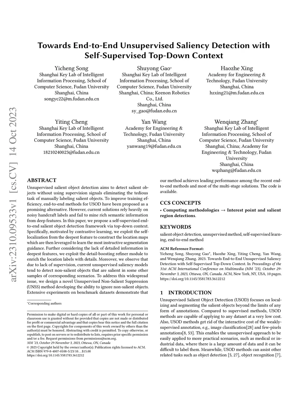 Unsupervised salient object detection aims to detect salient objects without using supervision signals eliminating the tedious task of manually labeling salient objects. To improve training efficiency, end-to-end methods for USOD have been proposed as a promising alternative. However, current solutions rely heavily on noisy handcraft labels and fail to mine rich semantic information from deep features. In this paper, we propose a self-supervised end-to-end salient object detection framework via top-down context. Specifically, motivated by contrastive learning, we exploit the self-localization from the deepest feature to construct the location maps which are then leveraged to learn the most instructive segmentation guidance. Further considering the lack of detailed information in deepest features, we exploit the detail-boosting refiner module to enrich the location labels with details. Moreover, we observe that due to lack of supervision, current unsupervised saliency models tend to detect non-salient objects that are salient in some other samples of corresponding scenarios. To address this widespread issue, we design a novel Unsupervised Non-Salient Suppression (UNSS) method developing the ability to ignore non-salient objects. Extensive experiments on benchmark datasets demonstrate that our method achieves leading performance among the recent end-to-end methods and most of the multi-stage solutions. The code is available.
