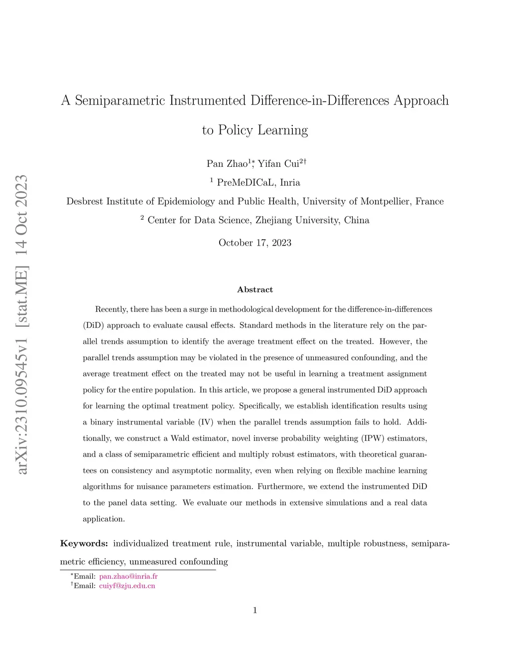 Recently, there has been a surge in methodological development for the difference-in-differences (DiD) approach to evaluate causal effects. Standard methods in the literature rely on the parallel trends assumption to identify the average treatment effect on the treated. However, the parallel trends assumption may be violated in the presence of unmeasured confounding, and the average treatment effect on the treated may not be useful in learning a treatment assignment policy for the entire population. In this article, we propose a general instrumented DiD approach for learning the optimal treatment policy. Specifically, we establish identification results using a binary instrumental variable (IV) when the parallel trends assumption fails to hold. Additionally, we construct a Wald estimator, novel inverse probability weighting (IPW) estimators, and a class of semiparametric efficient and multiply robust estimators, with theoretical guarantees on consistency and asymptotic normality, even when relying on flexible machine learning algorithms for nuisance parameters estimation. Furthermore, we extend the instrumented DiD to the panel data setting. We evaluate our methods in extensive simulations and a real data application.