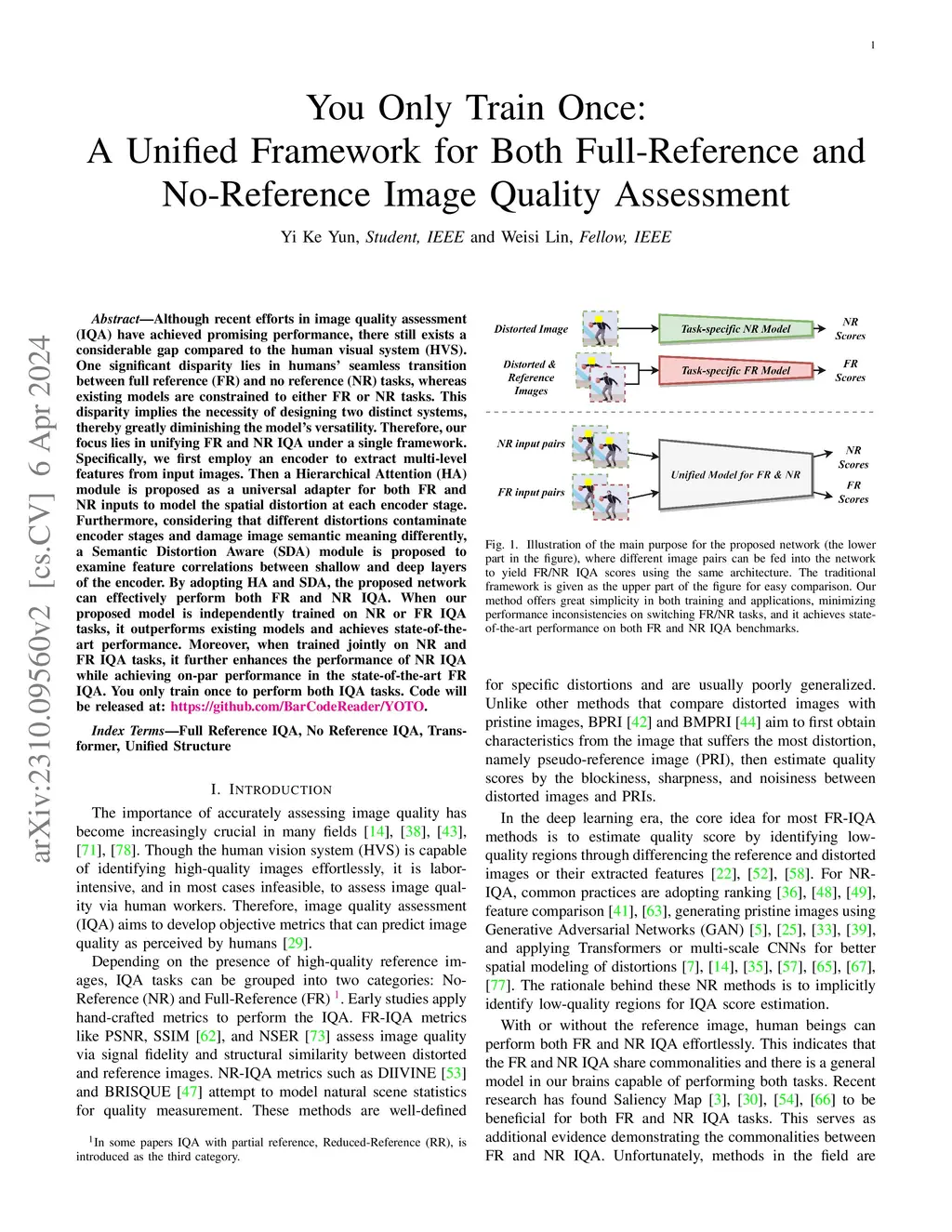 Although recent efforts in image quality assessment (IQA) have achieved promising performance, there still exists a considerable gap compared to the human visual system (HVS). One significant disparity lies in humans' seamless transition between full reference (FR) and no reference (NR) tasks, whereas existing models are constrained to either FR or NR tasks. This disparity implies the necessity of designing two distinct systems, thereby greatly diminishing the model's versatility. Therefore, our focus lies in unifying FR and NR IQA under a single framework. Specifically, we first employ an encoder to extract multi-level features from input images. Then a Hierarchical Attention (HA) module is proposed as a universal adapter for both FR and NR inputs to model the spatial distortion at each encoder stage. Furthermore, considering that different distortions contaminate encoder stages and damage image semantic meaning differently, a Semantic Distortion Aware (SDA) module is proposed to examine feature correlations between shallow and deep layers of the encoder. By adopting HA and SDA, the proposed network can effectively perform both FR and NR IQA. When our proposed model is independently trained on NR or FR IQA tasks, it outperforms existing models and achieves state-of-the-art performance. Moreover, when trained jointly on NR and FR IQA tasks, it further enhances the performance of NR IQA while achieving on-par performance in the state-of-the-art FR IQA. You only train once to perform both IQA tasks. Code will be released at: https://github.com/BarCodeReader/YOTO.
