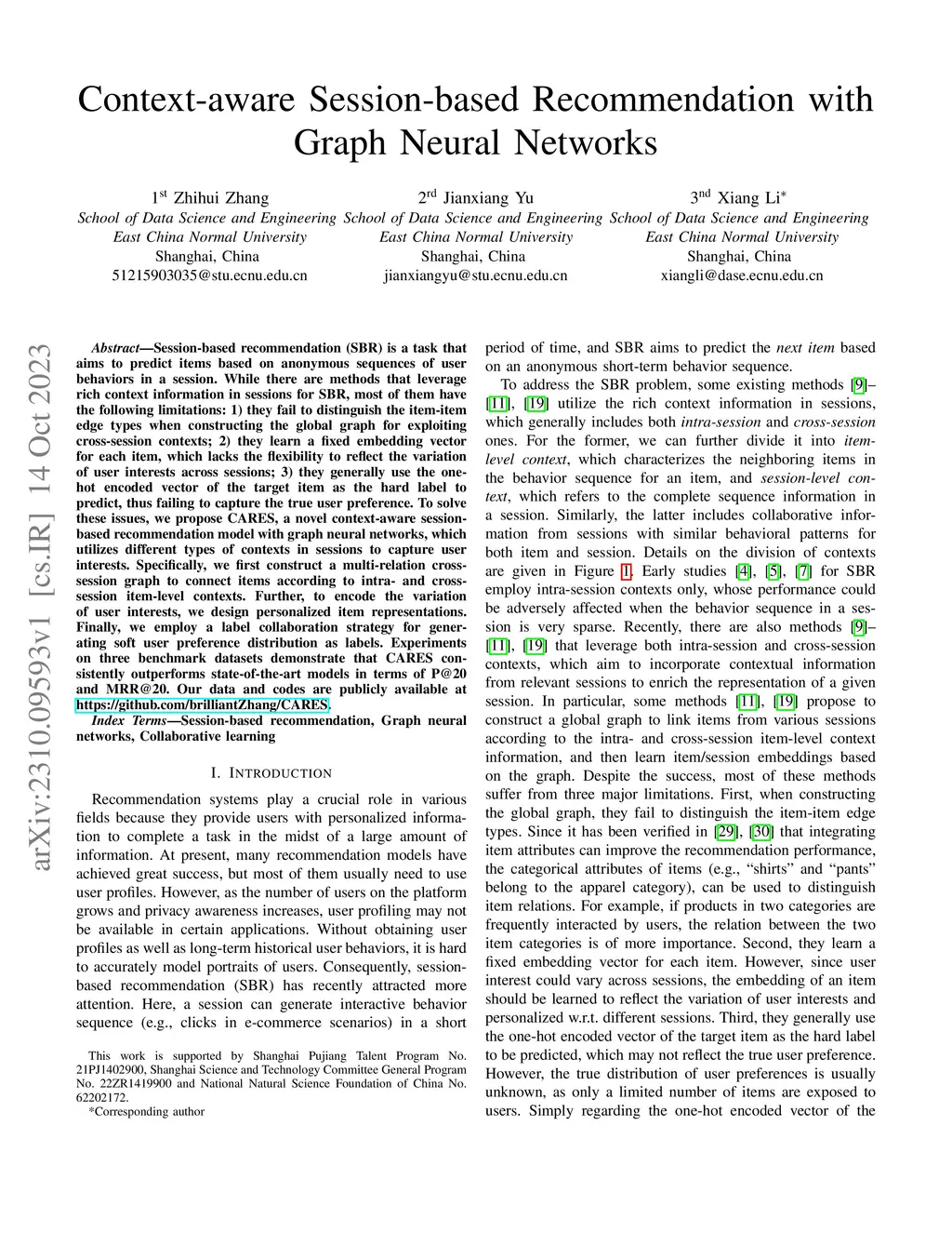 Session-based recommendation (SBR) is a task that aims to predict items based on anonymous sequences of user behaviors in a session. While there are methods that leverage rich context information in sessions for SBR, most of them have the following limitations: 1) they fail to distinguish the item-item edge types when constructing the global graph for exploiting cross-session contexts; 2) they learn a fixed embedding vector for each item, which lacks the flexibility to reflect the variation of user interests across sessions; 3) they generally use the one-hot encoded vector of the target item as the hard label to predict, thus failing to capture the true user preference. To solve these issues, we propose CARES, a novel context-aware session-based recommendation model with graph neural networks, which utilizes different types of contexts in sessions to capture user interests. Specifically, we first construct a multi-relation cross-session graph to connect items according to intra- and cross-session item-level contexts. Further, to encode the variation of user interests, we design personalized item representations. Finally, we employ a label collaboration strategy for generating soft user preference distribution as labels. Experiments on three benchmark datasets demonstrate that CARES consistently outperforms state-of-the-art models in terms of P@20 and MRR@20. Our data and codes are publicly available at https://github.com/brilliantZhang/CARES.