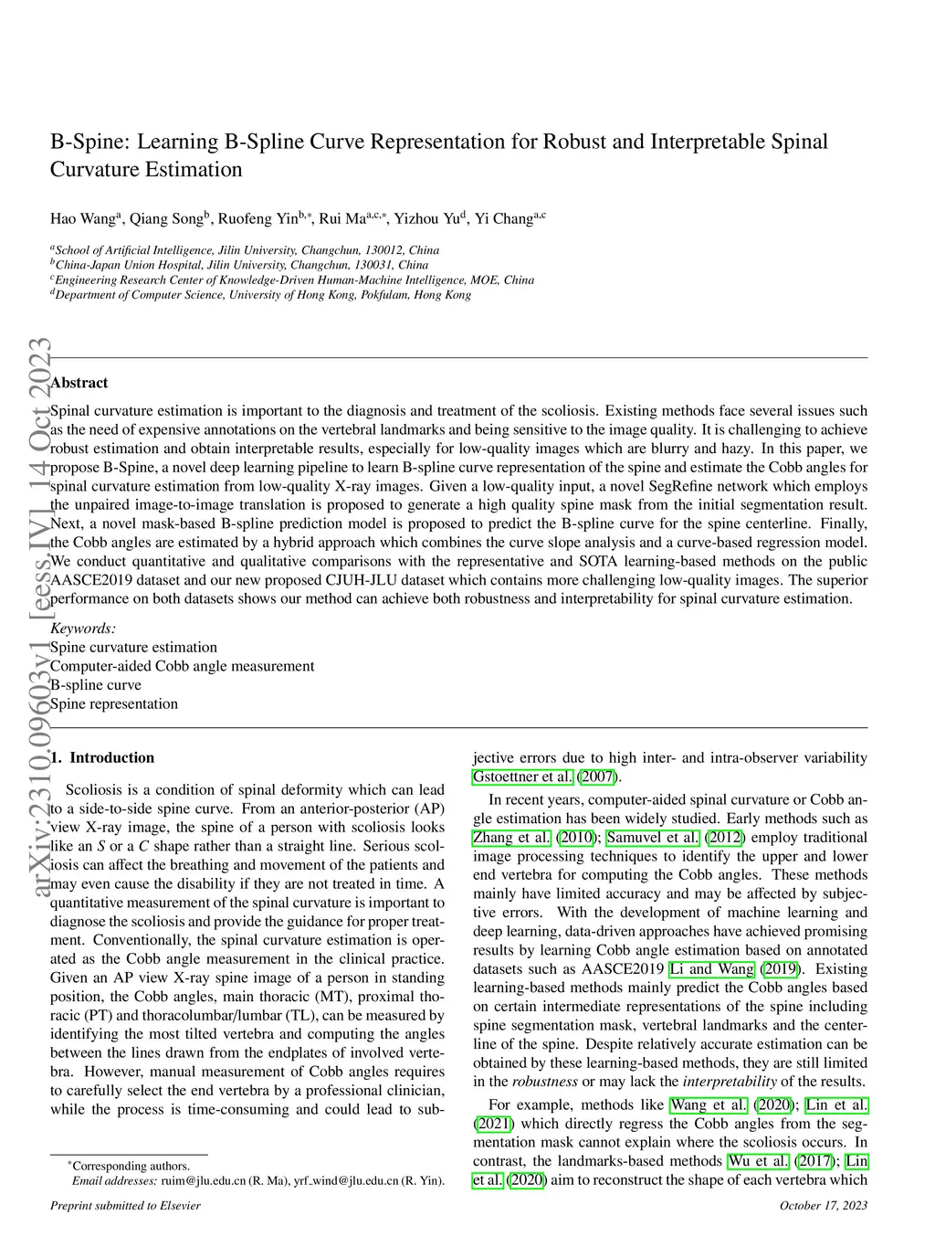 Spinal curvature estimation is important to the diagnosis and treatment of the scoliosis. Existing methods face several issues such as the need of expensive annotations on the vertebral landmarks and being sensitive to the image quality. It is challenging to achieve robust estimation and obtain interpretable results, especially for low-quality images which are blurry and hazy. In this paper, we propose B-Spine, a novel deep learning pipeline to learn B-spline curve representation of the spine and estimate the Cobb angles for spinal curvature estimation from low-quality X-ray images. Given a low-quality input, a novel SegRefine network which employs the unpaired image-to-image translation is proposed to generate a high quality spine mask from the initial segmentation result. Next, a novel mask-based B-spline prediction model is proposed to predict the B-spline curve for the spine centerline. Finally, the Cobb angles are estimated by a hybrid approach which combines the curve slope analysis and a curve-based regression model. We conduct quantitative and qualitative comparisons with the representative and SOTA learning-based methods on the public AASCE2019 dataset and our new proposed CJUH-JLU dataset which contains more challenging low-quality images. The superior performance on both datasets shows our method can achieve both robustness and interpretability for spinal curvature estimation.