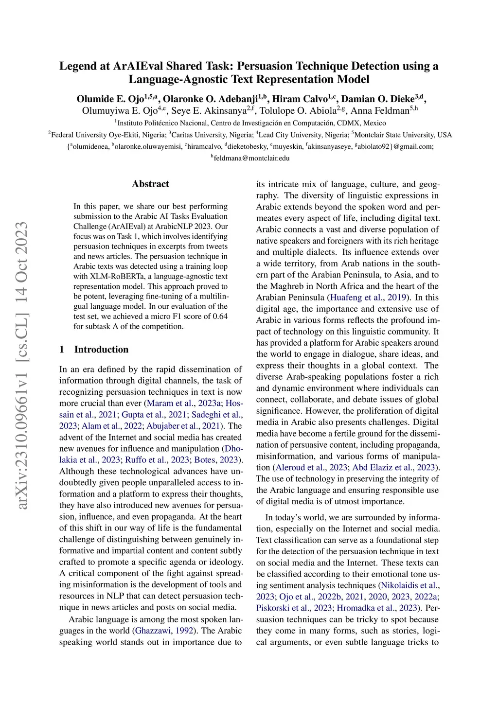 In this paper, we share our best performing submission to the Arabic AI Tasks Evaluation Challenge (ArAIEval) at ArabicNLP 2023. Our focus was on Task 1, which involves identifying persuasion techniques in excerpts from tweets and news articles. The persuasion technique in Arabic texts was detected using a training loop with XLM-RoBERTa, a language-agnostic text representation model. This approach proved to be potent, leveraging fine-tuning of a multilingual language model. In our evaluation of the test set, we achieved a micro F1 score of 0.64 for subtask A of the competition.