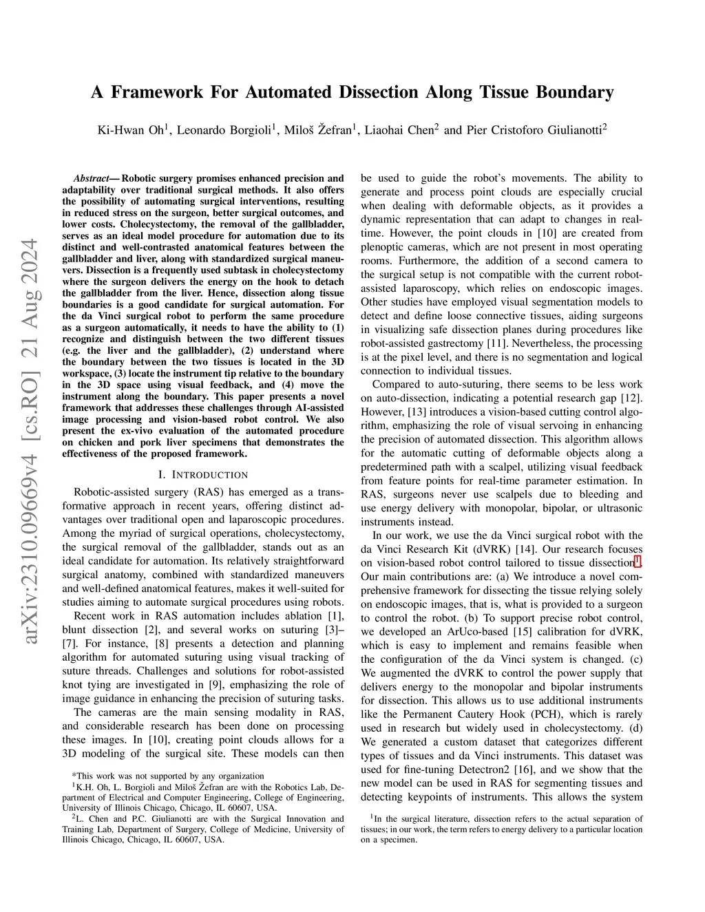 Robotic surgery promises enhanced precision and adaptability over traditional surgical methods. It also offers the possibility of automating surgical interventions, resulting in reduced stress on the surgeon, better surgical outcomes, and lower costs. Cholecystectomy, the removal of the gallbladder, serves as an ideal model procedure for automation due to its distinct and well-contrasted anatomical features between the gallbladder and liver, along with standardized surgical maneuvers. Dissection is a frequently used subtask in cholecystectomy where the surgeon delivers the energy on the hook to detach the gallbladder from the liver. Hence, dissection along tissue boundaries is a good candidate for surgical automation. For the da Vinci surgical robot to perform the same procedure as a surgeon automatically, it needs to have the ability to (1) recognize and distinguish between the two different tissues (e.g. the liver and the gallbladder), (2) understand where the boundary between the two tissues is located in the 3D workspace, (3) locate the instrument tip relative to the boundary in the 3D space using visual feedback, and (4) move the instrument along the boundary. This paper presents a novel framework that addresses these challenges through AI-assisted image processing and vision-based robot control. We also present the ex-vivo evaluation of the automated procedure on chicken and pork liver specimens that demonstrates the effectiveness of the proposed framework.