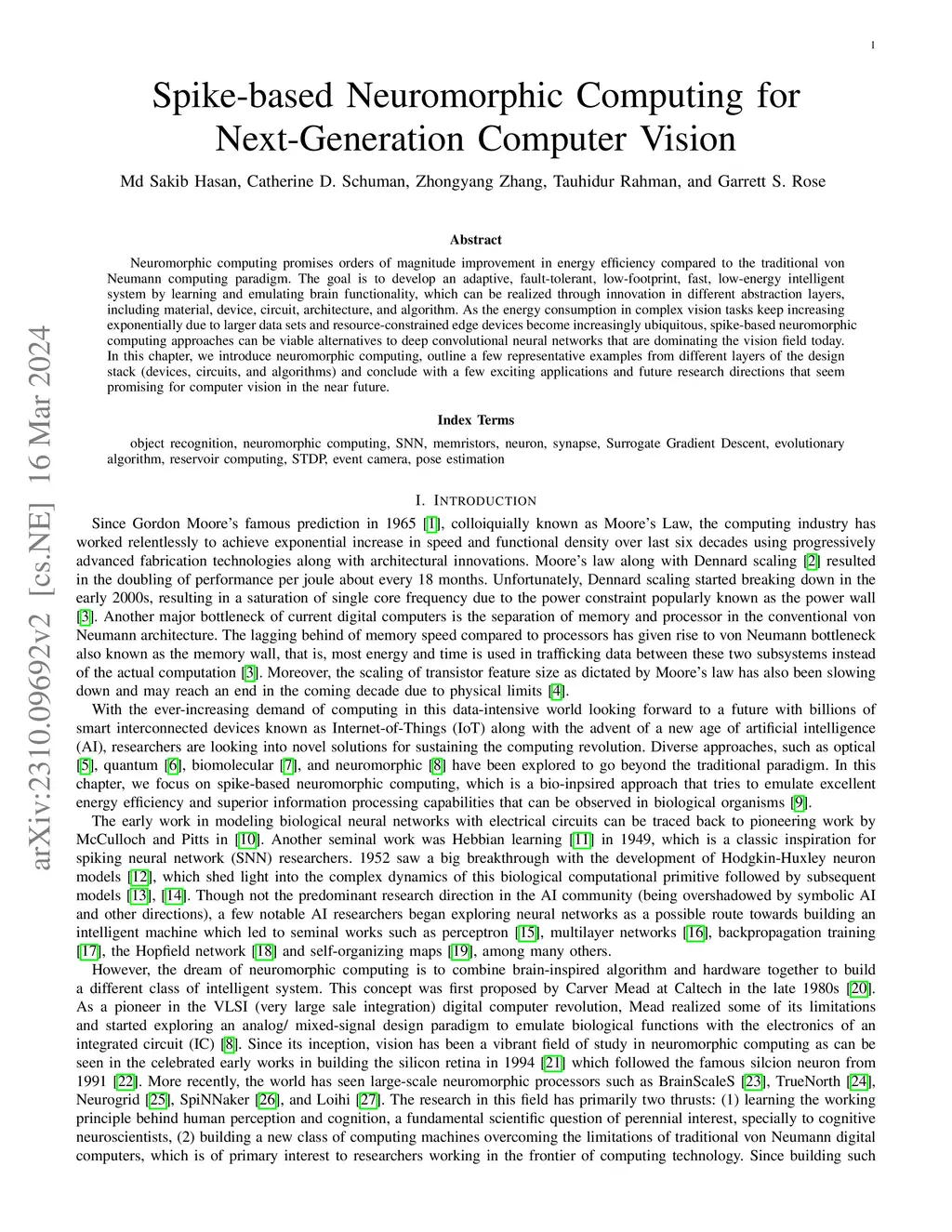 Neuromorphic Computing promises orders of magnitude improvement in energy efficiency compared to traditional von Neumann computing paradigm. The goal is to develop an adaptive, fault-tolerant, low-footprint, fast, low-energy intelligent system by learning and emulating brain functionality which can be realized through innovation in different abstraction layers including material, device, circuit, architecture and algorithm. As the energy consumption in complex vision tasks keep increasing exponentially due to larger data set and resource-constrained edge devices become increasingly ubiquitous, spike-based neuromorphic computing approaches can be viable alternative to deep convolutional neural network that is dominating the vision field today. In this book chapter, we introduce neuromorphic computing, outline a few representative examples from different layers of the design stack (devices, circuits and algorithms) and conclude with a few exciting applications and future research directions that seem promising for computer vision in the near future.
