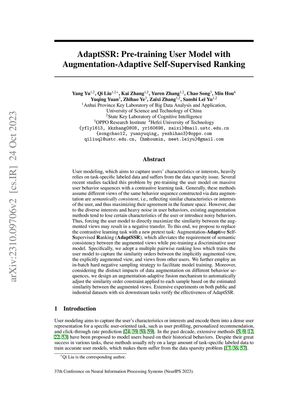 AdaptSSR: Pre-training User Model with Augmentation-Adaptive