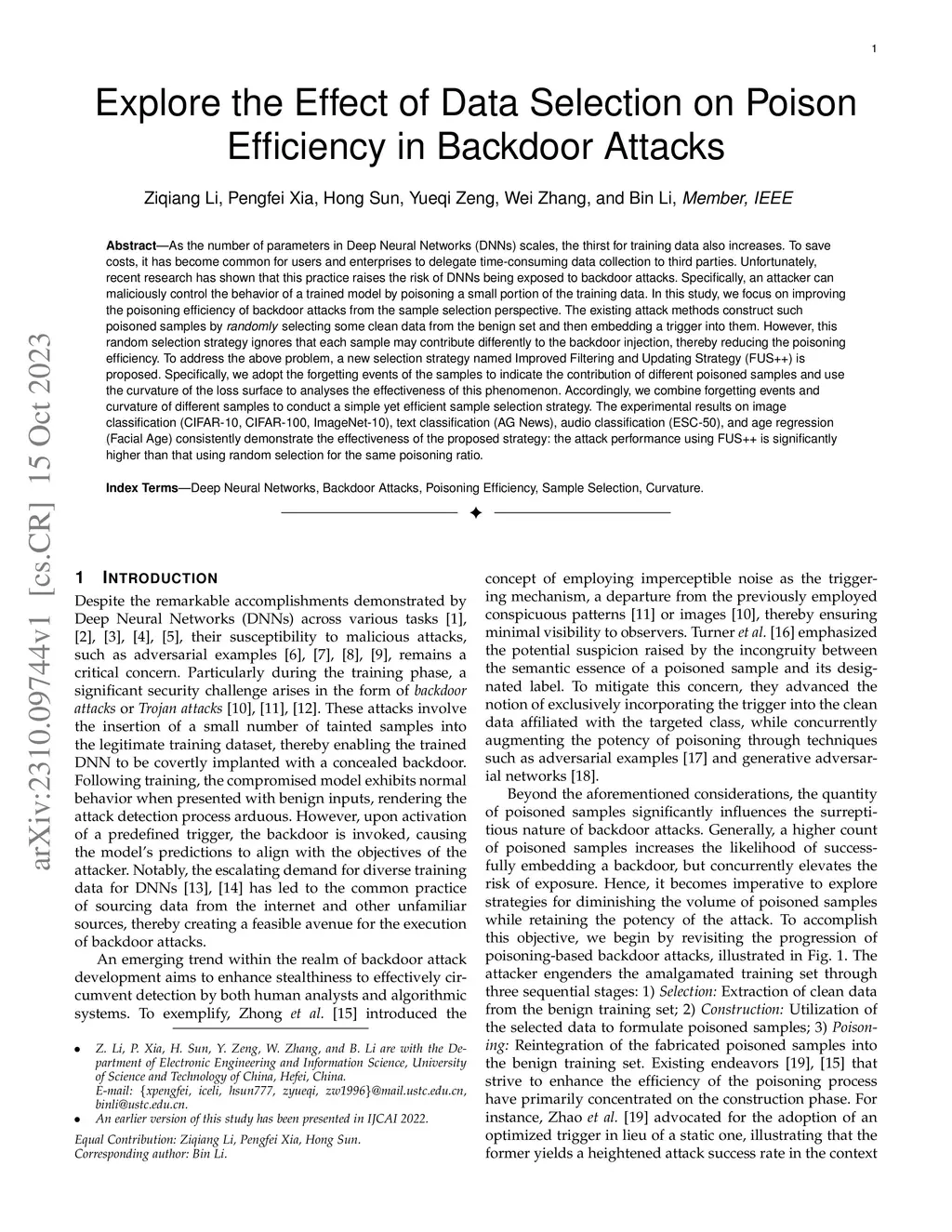 As the number of parameters in Deep Neural Networks (DNNs) scales, the thirst for training data also increases. To save costs, it has become common for users and enterprises to delegate time-consuming data collection to third parties. Unfortunately, recent research has shown that this practice raises the risk of DNNs being exposed to backdoor attacks. Specifically, an attacker can maliciously control the behavior of a trained model by poisoning a small portion of the training data. In this study, we focus on improving the poisoning efficiency of backdoor attacks from the sample selection perspective. The existing attack methods construct such poisoned samples by randomly selecting some clean data from the benign set and then embedding a trigger into them. However, this random selection strategy ignores that each sample may contribute differently to the backdoor injection, thereby reducing the poisoning efficiency. To address the above problem, a new selection strategy named Improved Filtering and Updating Strategy (FUS++) is proposed. Specifically, we adopt the forgetting events of the samples to indicate the contribution of different poisoned samples and use the curvature of the loss surface to analyses the effectiveness of this phenomenon. Accordingly, we combine forgetting events and curvature of different samples to conduct a simple yet efficient sample selection strategy. The experimental results on image classification (CIFAR-10, CIFAR-100, ImageNet-10), text classification (AG News), audio classification (ESC-50), and age regression (Facial Age) consistently demonstrate the effectiveness of the proposed strategy: the attack performance using FUS++ is significantly higher than that using random selection for the same poisoning ratio.