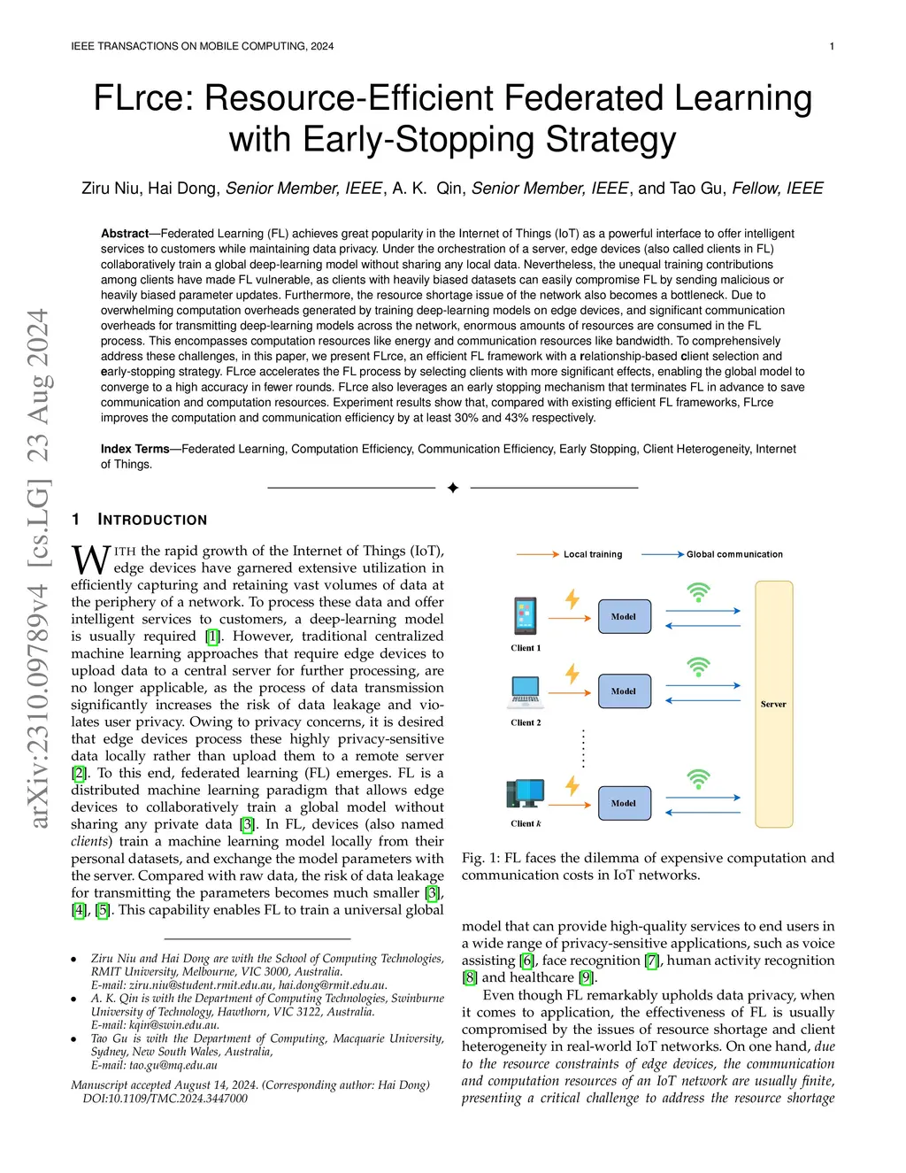 Federated learning (FL) achieves great popularity in the Internet of Things (IoT) as a powerful interface to offer intelligent services to customers while maintaining data privacy. Under the orchestration of a server, edge devices (also called clients in FL) collaboratively train a global deep-learning model without sharing any local data. Nevertheless, the unequal training contributions among clients have made FL vulnerable, as clients with heavily biased datasets can easily compromise FL by sending malicious or heavily biased parameter updates. Furthermore, the resource shortage issue of edge devices also becomes a bottleneck. Due to overwhelming computation overheads generated by training deep-learning models on edge devices, and significant communication overheads for transmitting deep-learning models across the network, enormous amounts of resources are consumed in the FL process. This encompasses computation resources like energy and communication resources like bandwidth. To comprehensively address these challenges, in this paper, we present FLrce, an efficient FL framework with a relationship-based client selection and early-stopping strategy. FLrce accelerates the FL process by selecting clients with more significant effects, enabling the global model to converge to a high accuracy in fewer rounds. FLrce also leverages an early stopping mechanism that terminates FL in advance to save communication and computation resources. Experiment results show that, compared with existing efficient FL frameworks, FLrce improves the computation and communication efficiency by at least 47% and 43% respectively.