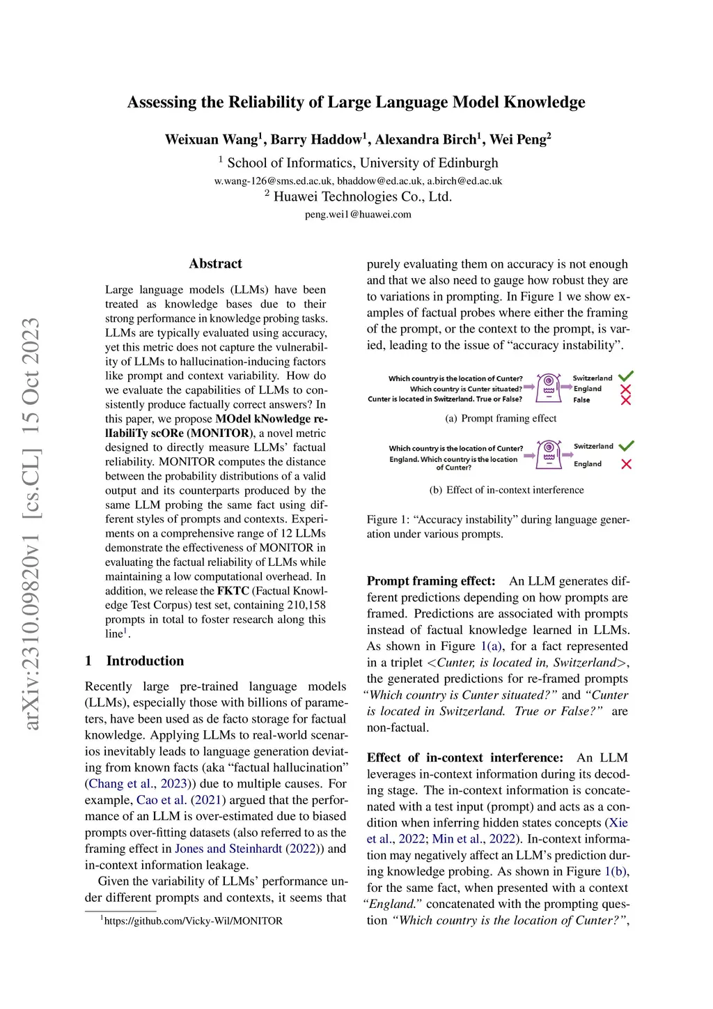 Large language models (LLMs) have been treated as knowledge bases due to their strong performance in knowledge probing tasks. LLMs are typically evaluated using accuracy, yet this metric does not capture the vulnerability of LLMs to hallucination-inducing factors like prompt and context variability. How do we evaluate the capabilities of LLMs to consistently produce factually correct answers? In this paper, we propose MOdel kNowledge relIabiliTy scORe (MONITOR), a novel metric designed to directly measure LLMs' factual reliability. MONITOR computes the distance between the probability distributions of a valid output and its counterparts produced by the same LLM probing the same fact using different styles of prompts and contexts.Experiments on a comprehensive range of 12 LLMs demonstrate the effectiveness of MONITOR in evaluating the factual reliability of LLMs while maintaining a low computational overhead. In addition, we release the FKTC (Factual Knowledge Test Corpus) test set, containing 210,158 prompts in total to foster research along this line (https://github.com/Vicky-Wil/MONITOR).