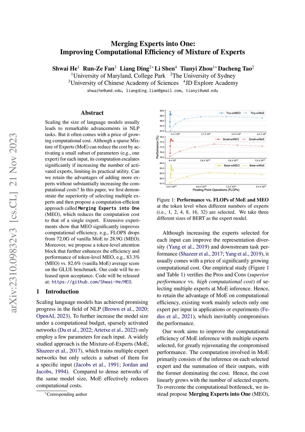 Scaling the size of language models usually leads to remarkable advancements in NLP tasks. But it often comes with a price of growing computational cost. Although a sparse Mixture of Experts (MoE) can reduce the cost by activating a small subset of parameters (e.g., one expert) for each input, its computation escalates significantly if increasing the number of activated experts, limiting its practical utility. Can we retain the advantages of adding more experts without substantially increasing the computational costs? In this paper, we first demonstrate the superiority of selecting multiple experts and then propose a computation-efficient approach called \textbf{\texttt{Merging Experts into One}} (MEO), which reduces the computation cost to that of a single expert. Extensive experiments show that MEO significantly improves computational efficiency, e.g., FLOPS drops from 72.0G of vanilla MoE to 28.6G (MEO). Moreover, we propose a token-level attention block that further enhances the efficiency and performance of token-level MEO, e.g., 83.3\% (MEO) vs. 82.6\% (vanilla MoE) average score on the GLUE benchmark. Our code will be released upon acceptance. Code will be released at: \url{https://github.com/Shwai-He/MEO}.