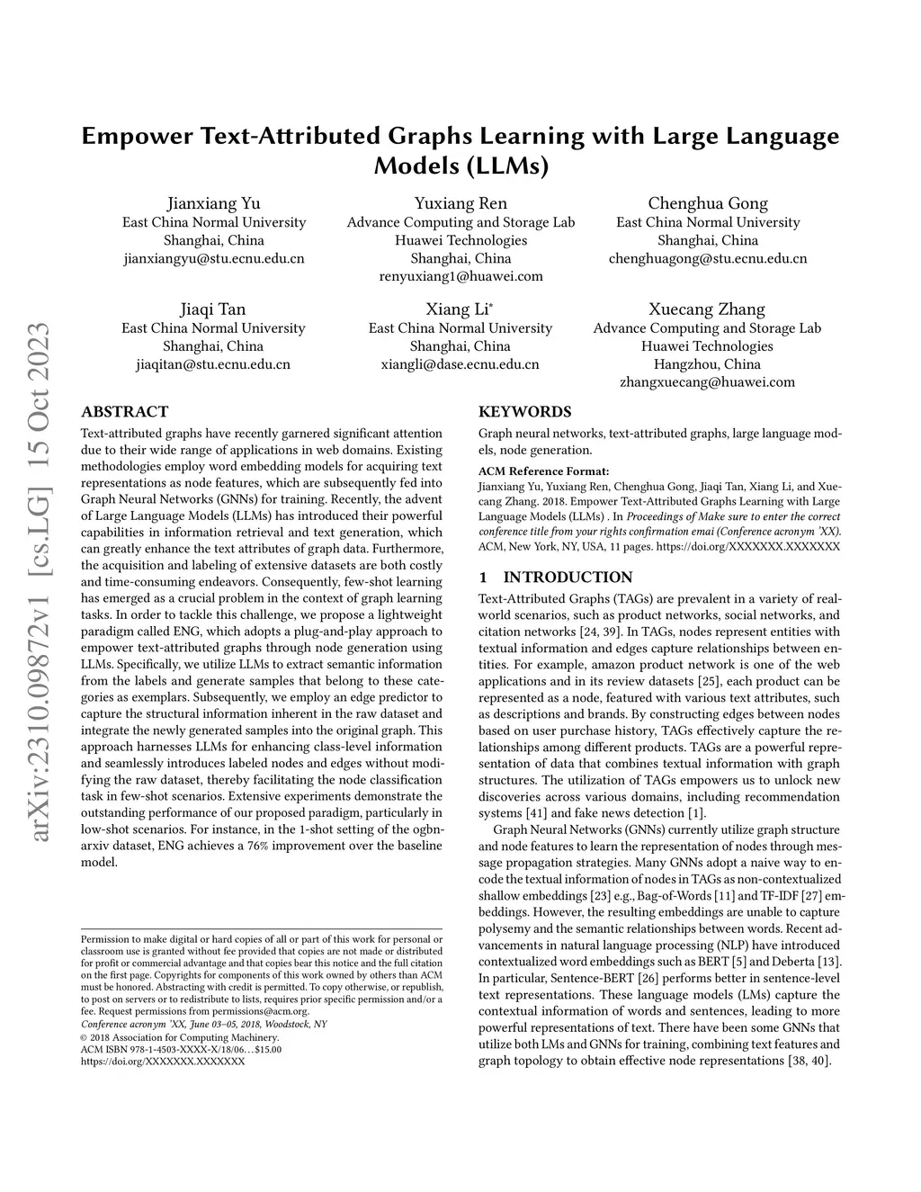 Text-attributed graphs have recently garnered significant attention due to their wide range of applications in web domains. Existing methodologies employ word embedding models for acquiring text representations as node features, which are subsequently fed into Graph Neural Networks (GNNs) for training. Recently, the advent of Large Language Models (LLMs) has introduced their powerful capabilities in information retrieval and text generation, which can greatly enhance the text attributes of graph data. Furthermore, the acquisition and labeling of extensive datasets are both costly and time-consuming endeavors. Consequently, few-shot learning has emerged as a crucial problem in the context of graph learning tasks. In order to tackle this challenge, we propose a lightweight paradigm called ENG, which adopts a plug-and-play approach to empower text-attributed graphs through node generation using LLMs. Specifically, we utilize LLMs to extract semantic information from the labels and generate samples that belong to these categories as exemplars. Subsequently, we employ an edge predictor to capture the structural information inherent in the raw dataset and integrate the newly generated samples into the original graph. This approach harnesses LLMs for enhancing class-level information and seamlessly introduces labeled nodes and edges without modifying the raw dataset, thereby facilitating the node classification task in few-shot scenarios. Extensive experiments demonstrate the outstanding performance of our proposed paradigm, particularly in low-shot scenarios. For instance, in the 1-shot setting of the ogbn-arxiv dataset, ENG achieves a 76% improvement over the baseline model.