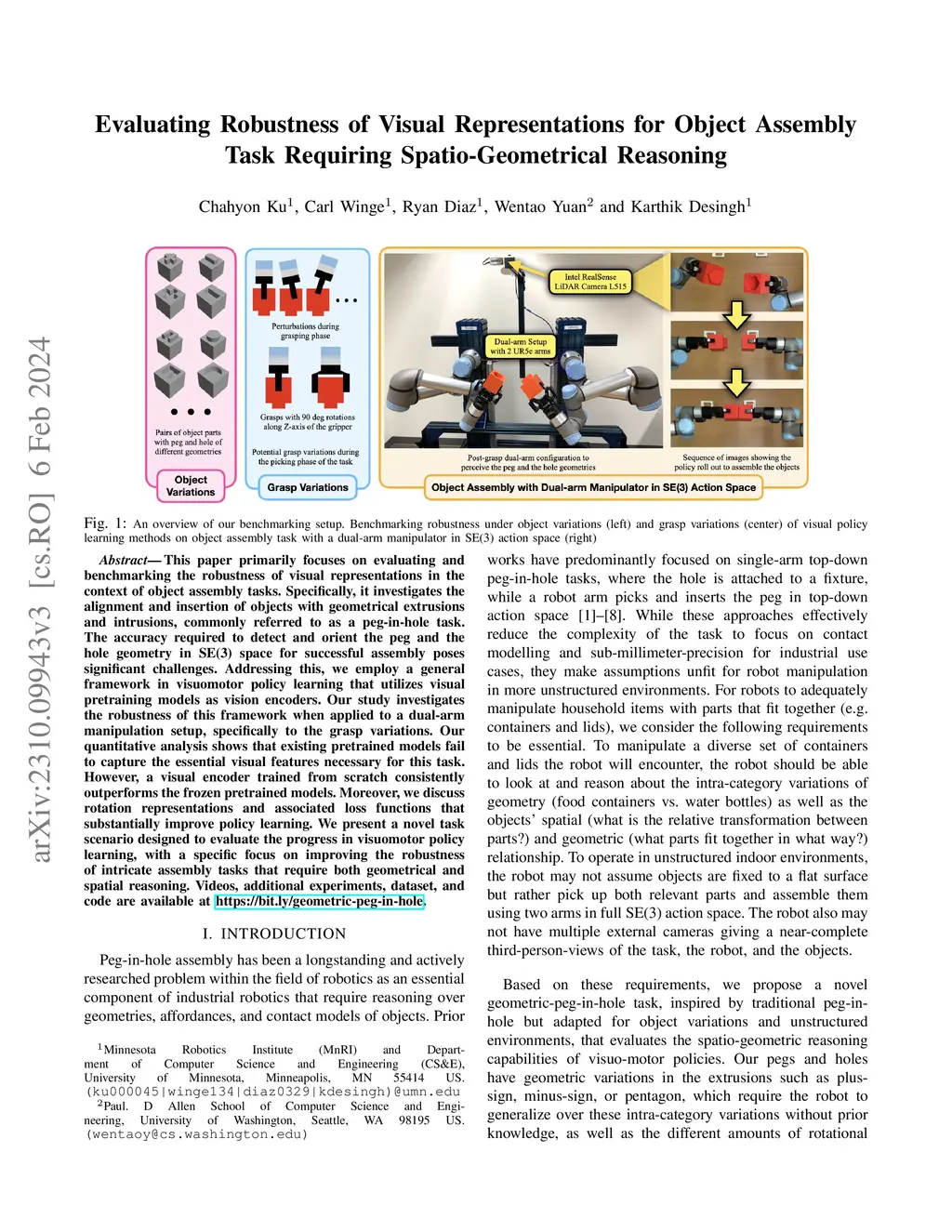 This paper primarily focuses on evaluating and benchmarking the robustness of visual representations in the context of object assembly tasks. Specifically, it investigates the alignment and insertion of objects with geometrical extrusions and intrusions, commonly referred to as a peg-in-hole task. The accuracy required to detect and orient the peg and the hole geometry in SE(3) space for successful assembly poses significant challenges. Addressing this, we employ a general framework in visuomotor policy learning that utilizes visual pretraining models as vision encoders. Our study investigates the robustness of this framework when applied to a dual-arm manipulation setup, specifically to the grasp variations. Our quantitative analysis shows that existing pretrained models fail to capture the essential visual features necessary for this task. However, a visual encoder trained from scratch consistently outperforms the frozen pretrained models. Moreover, we discuss rotation representations and associated loss functions that substantially improve policy learning. We present a novel task scenario designed to evaluate the progress in visuomotor policy learning, with a specific focus on improving the robustness of intricate assembly tasks that require both geometrical and spatial reasoning. Videos, additional experiments, dataset, and code are available at https://bit.ly/geometric-peg-in-hole .