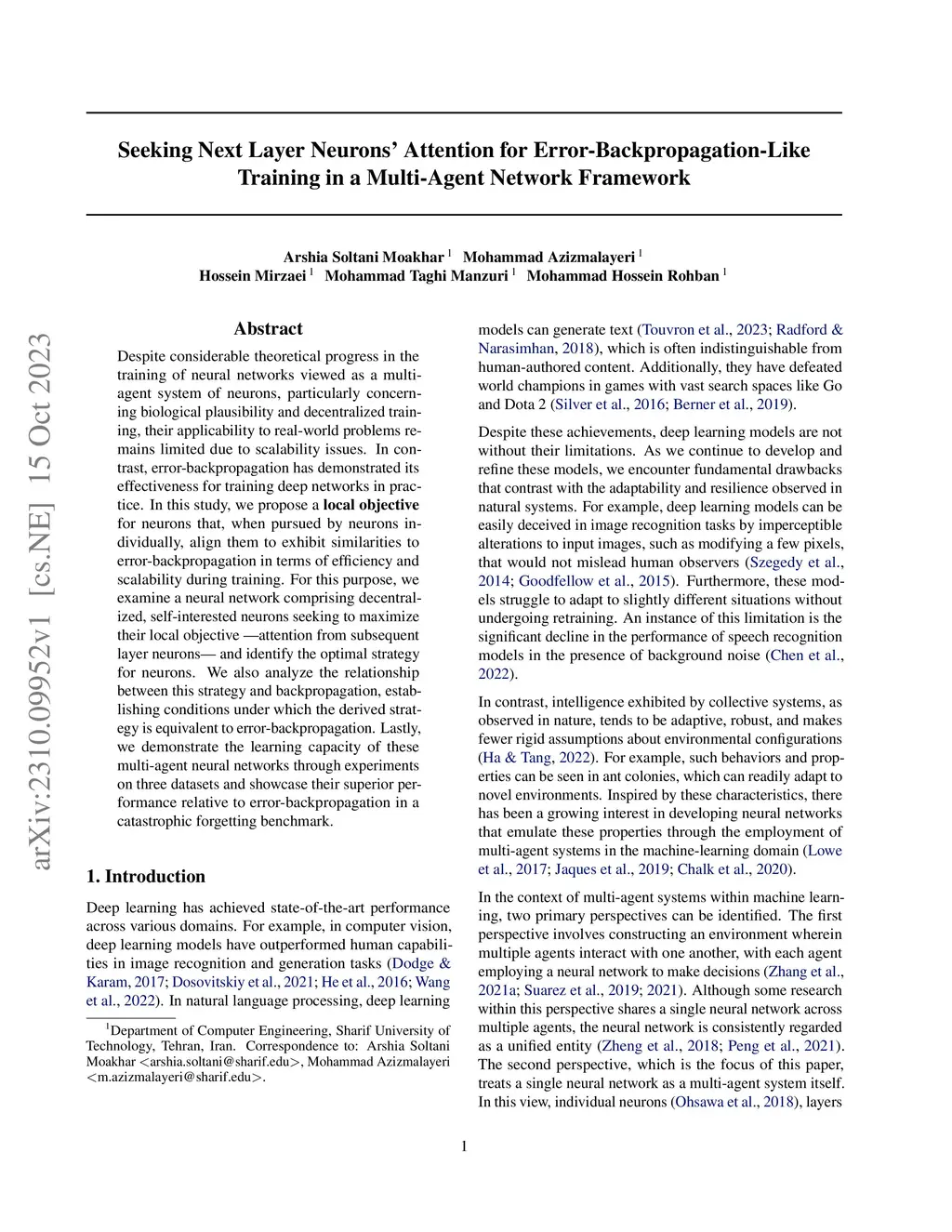 Despite considerable theoretical progress in the training of neural networks viewed as a multi-agent system of neurons, particularly concerning biological plausibility and decentralized training, their applicability to real-world problems remains limited due to scalability issues. In contrast, error-backpropagation has demonstrated its effectiveness for training deep networks in practice. In this study, we propose a local objective for neurons that, when pursued by neurons individually, align them to exhibit similarities to error-backpropagation in terms of efficiency and scalability during training. For this purpose, we examine a neural network comprising decentralized, self-interested neurons seeking to maximize their local objective -- attention from subsequent layer neurons -- and identify the optimal strategy for neurons. We also analyze the relationship between this strategy and backpropagation, establishing conditions under which the derived strategy is equivalent to error-backpropagation. Lastly, we demonstrate the learning capacity of these multi-agent neural networks through experiments on three datasets and showcase their superior performance relative to error-backpropagation in a catastrophic forgetting benchmark.