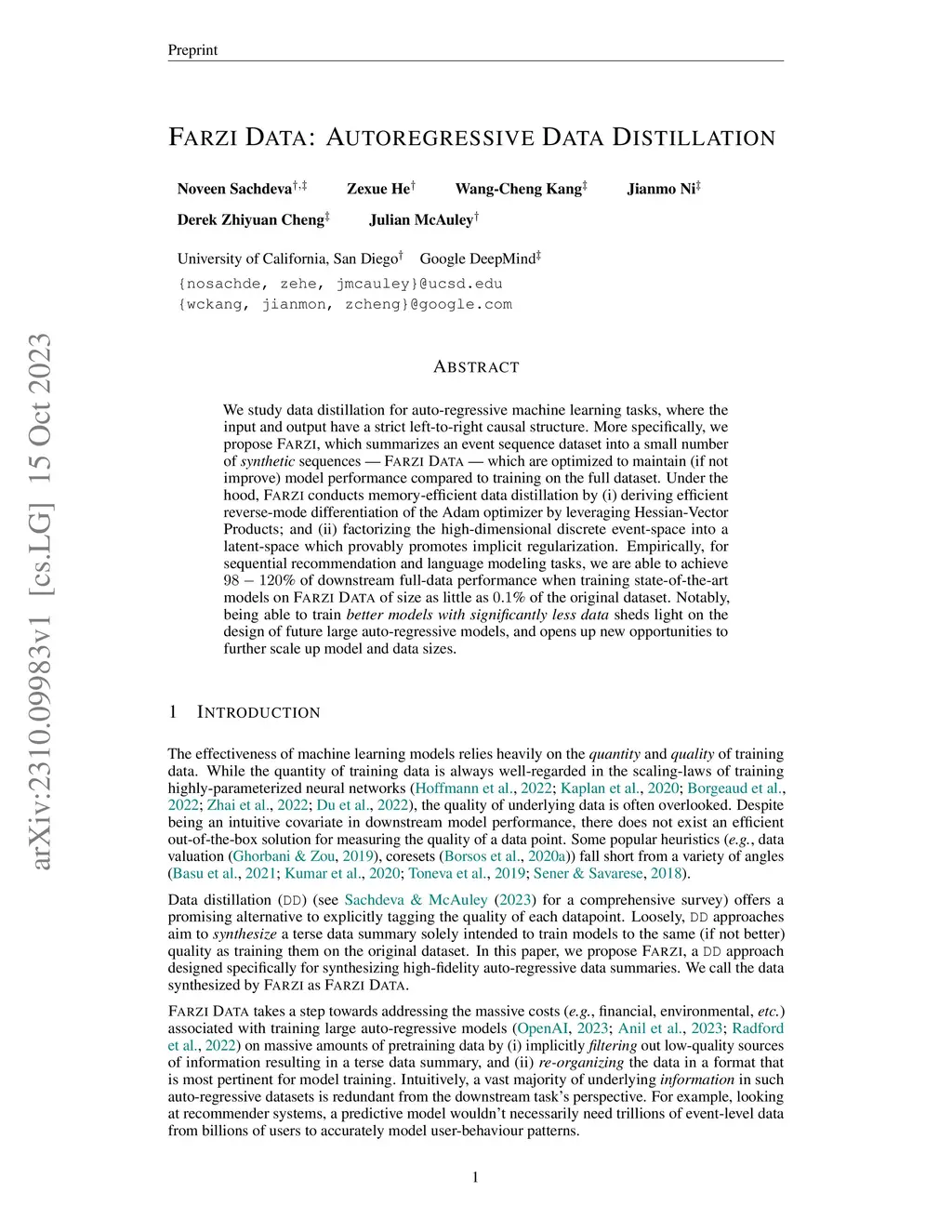 We study data distillation for auto-regressive machine learning tasks, where the input and output have a strict left-to-right causal structure. More specifically, we propose Farzi, which summarizes an event sequence dataset into a small number of synthetic sequences -- Farzi Data -- which are optimized to maintain (if not improve) model performance compared to training on the full dataset. Under the hood, Farzi conducts memory-efficient data distillation by (i) deriving efficient reverse-mode differentiation of the Adam optimizer by leveraging Hessian-Vector Products; and (ii) factorizing the high-dimensional discrete event-space into a latent-space which provably promotes implicit regularization. Empirically, for sequential recommendation and language modeling tasks, we are able to achieve 98-120% of downstream full-data performance when training state-of-the-art models on Farzi Data of size as little as 0.1% of the original dataset. Notably, being able to train better models with significantly less data sheds light on the design of future large auto-regressive models, and opens up new opportunities to further scale up model and data sizes.