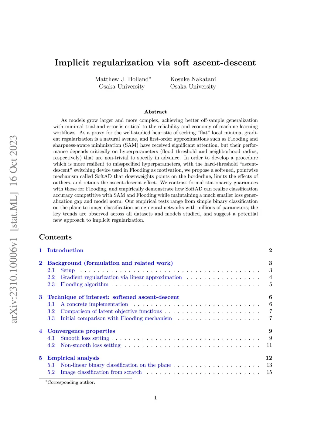As models grow larger and more complex, achieving better off-sample generalization with minimal trial-and-error is critical to the reliability and economy of machine learning workflows. As a proxy for the well-studied heuristic of seeking "flat" local minima, gradient regularization is a natural avenue, and first-order approximations such as Flooding and sharpness-aware minimization (SAM) have received significant attention, but their performance depends critically on hyperparameters (flood threshold and neighborhood radius, respectively) that are non-trivial to specify in advance. In order to develop a procedure which is more resilient to misspecified hyperparameters, with the hard-threshold "ascent-descent" switching device used in Flooding as motivation, we propose a softened, pointwise mechanism called SoftAD that downweights points on the borderline, limits the effects of outliers, and retains the ascent-descent effect. We contrast formal stationarity guarantees with those for Flooding, and empirically demonstrate how SoftAD can realize classification accuracy competitive with SAM and Flooding while maintaining a much smaller loss generalization gap and model norm. Our empirical tests range from simple binary classification on the plane to image classification using neural networks with millions of parameters; the key trends are observed across all datasets and models studied, and suggest a potential new approach to implicit regularization.