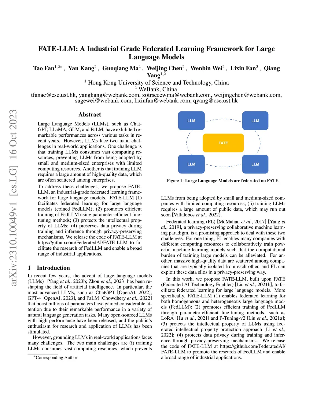 Large Language Models (LLMs), such as ChatGPT, LLaMA, GLM, and PaLM, have exhibited remarkable performances across various tasks in recent years. However, LLMs face two main challenges in real-world applications. One challenge is that training LLMs consumes vast computing resources, preventing LLMs from being adopted by small and medium-sized enterprises with limited computing resources. Another is that training LLM requires a large amount of high-quality data, which are often scattered among enterprises. To address these challenges, we propose FATE-LLM, an industrial-grade federated learning framework for large language models. FATE-LLM (1) facilitates federated learning for large language models (coined FedLLM); (2) promotes efficient training of FedLLM using parameter-efficient fine-tuning methods; (3) protects the intellectual property of LLMs; (4) preserves data privacy during training and inference through privacy-preserving mechanisms. We release the code of FATE-LLM at https://github.com/FederatedAI/FATE-LLM to facilitate the research of FedLLM and enable a broad range of industrial applications.