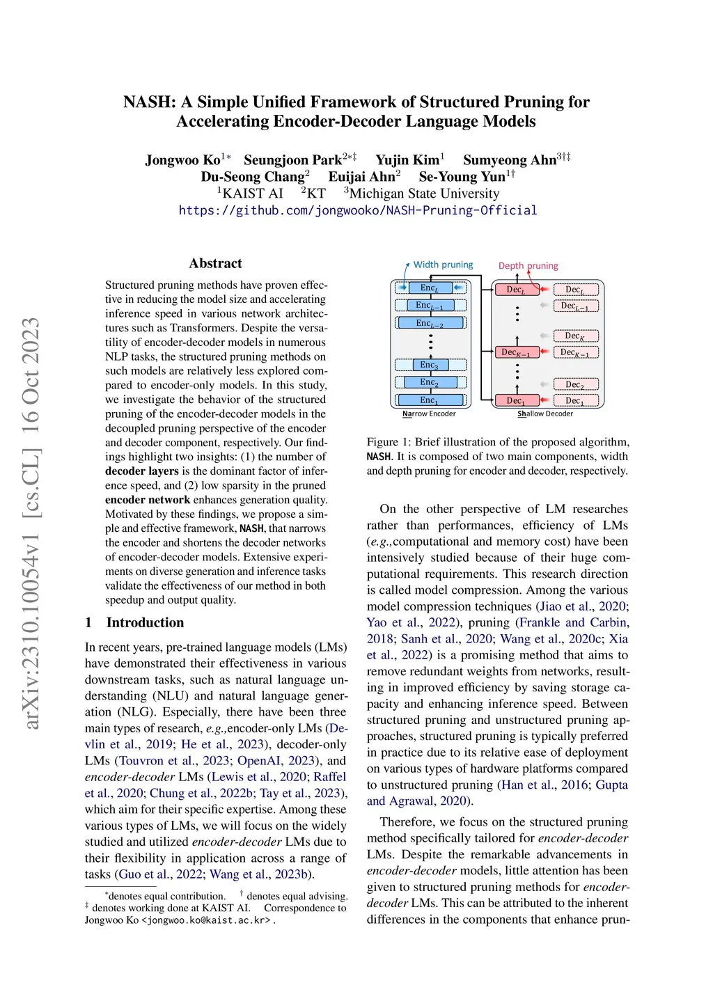 Structured pruning methods have proven effective in reducing the model size and accelerating inference speed in various network architectures such as Transformers. Despite the versatility of encoder-decoder models in numerous NLP tasks, the structured pruning methods on such models are relatively less explored compared to encoder-only models. In this study, we investigate the behavior of the structured pruning of the encoder-decoder models in the decoupled pruning perspective of the encoder and decoder component, respectively. Our findings highlight two insights: (1) the number of decoder layers is the dominant factor of inference speed, and (2) low sparsity in the pruned encoder network enhances generation quality. Motivated by these findings, we propose a simple and effective framework, NASH, that narrows the encoder and shortens the decoder networks of encoder-decoder models. Extensive experiments on diverse generation and inference tasks validate the effectiveness of our method in both speedup and output quality.