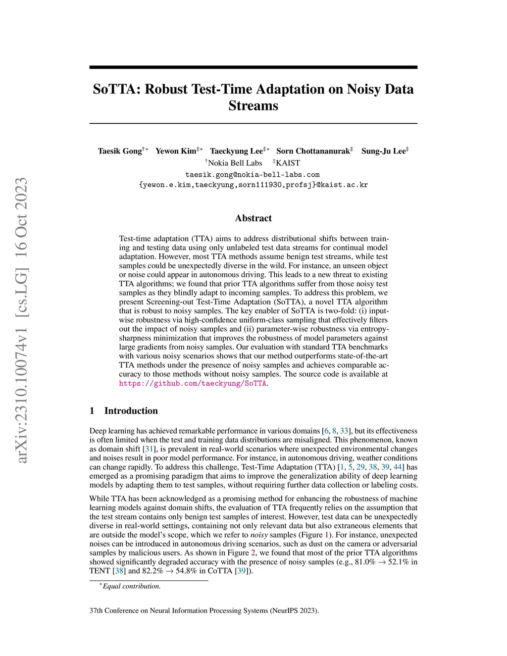 SoTTA: Robust Test-Time Adaptation on Noisy Data Streams