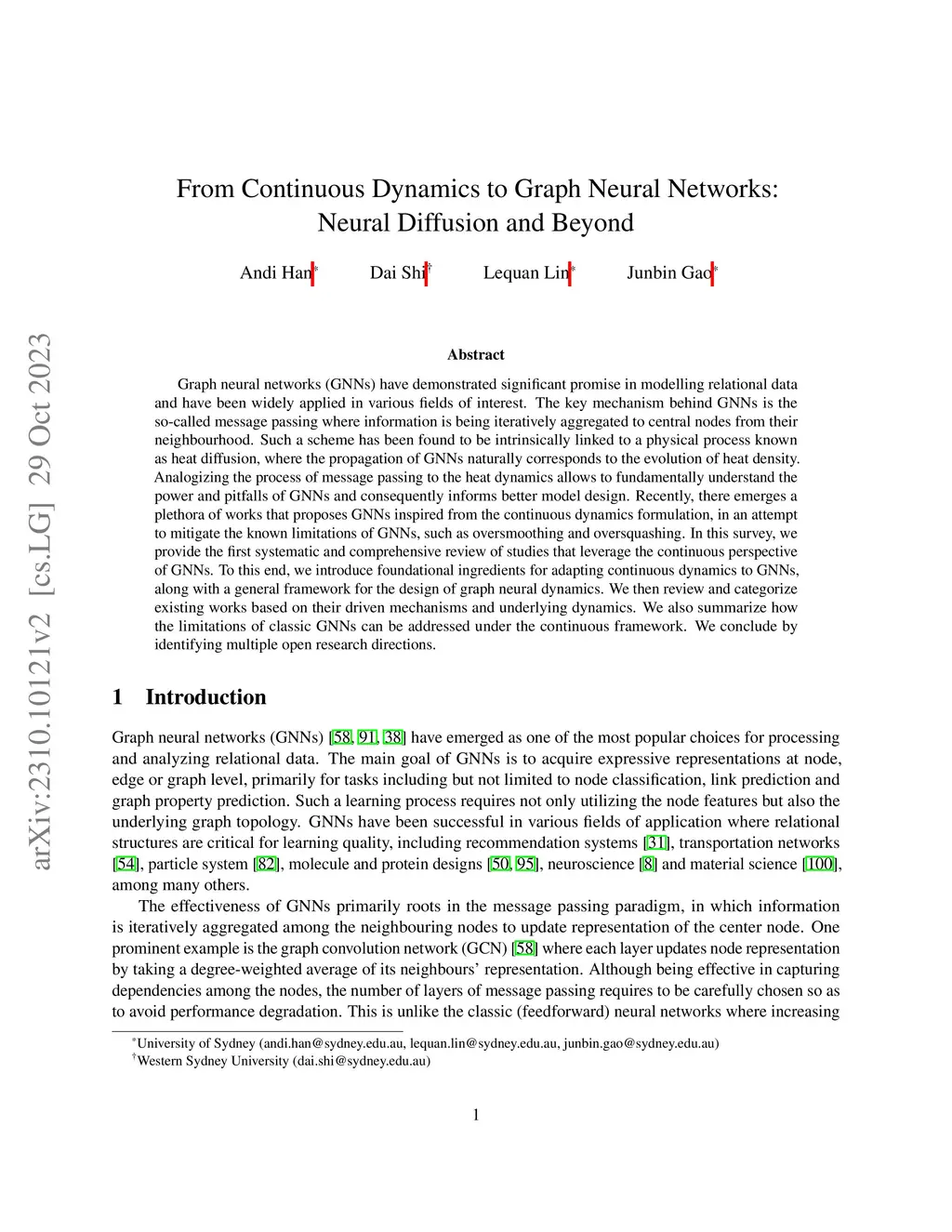 From Continuous Dynamics to Graph Neural Networks: Neural Diffusion and