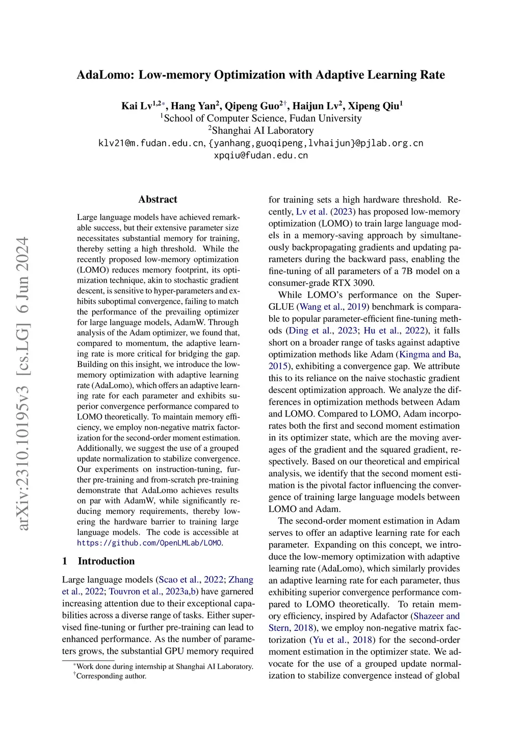 AdaLomo: Low-memory Optimization with Adaptive Learning Rate