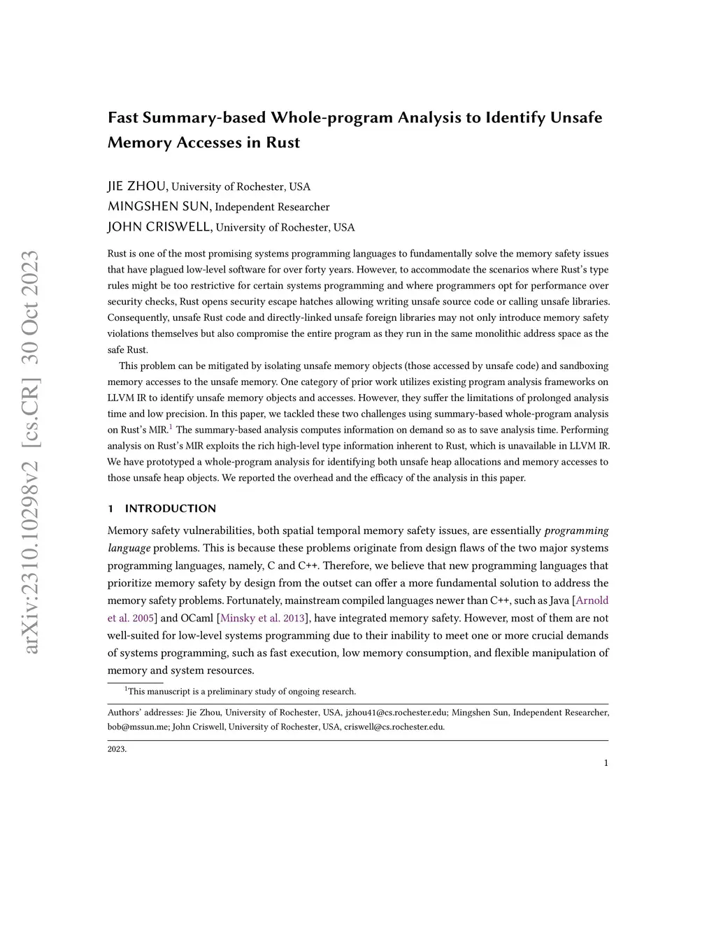 Rust is one of the most promising systems programming languages to fundamentally solve the memory safety issues that have plagued low-level software for over forty years. However, to accommodate the scenarios where Rust's type rules might be too restrictive for certain systems programming and where programmers opt for performance over security checks, Rust opens security escape hatches allowing writing unsafe source code or calling unsafe libraries. Consequently, unsafe Rust code and directly-linked unsafe foreign libraries may not only introduce memory safety violations themselves but also compromise the entire program as they run in the same monolithic address space as the safe Rust. This problem can be mitigated by isolating unsafe memory objects (those accessed by unsafe code) and sandboxing memory accesses to the unsafe memory. One category of prior work utilizes existing program analysis frameworks on LLVM IR to identify unsafe memory objects and accesses. However, they suffer the limitations of prolonged analysis time and low precision. In this paper, we tackled these two challenges using summary-based whole-program analysis on Rust's MIR. The summary-based analysis computes information on demand so as to save analysis time. Performing analysis on Rust's MIR exploits the rich high-level type information inherent to Rust, which is unavailable in LLVM IR. This manuscript is a preliminary study of ongoing research. We have prototyped a whole-program analysis for identifying both unsafe heap allocations and memory accesses to those unsafe heap objects. We reported the overhead and the efficacy of the analysis in this paper.