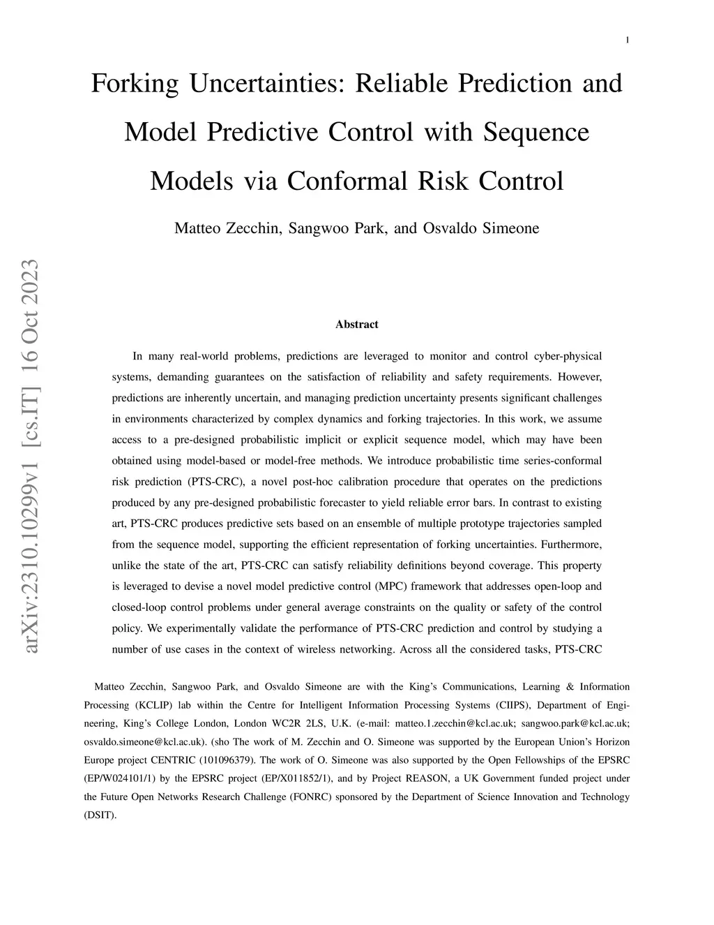 In many real-world problems, predictions are leveraged to monitor and control cyber-physical systems, demanding guarantees on the satisfaction of reliability and safety requirements. However, predictions are inherently uncertain, and managing prediction uncertainty presents significant challenges in environments characterized by complex dynamics and forking trajectories. In this work, we assume access to a pre-designed probabilistic implicit or explicit sequence model, which may have been obtained using model-based or model-free methods. We introduce probabilistic time series-conformal risk prediction (PTS-CRC), a novel post-hoc calibration procedure that operates on the predictions produced by any pre-designed probabilistic forecaster to yield reliable error bars. In contrast to existing art, PTS-CRC produces predictive sets based on an ensemble of multiple prototype trajectories sampled from the sequence model, supporting the efficient representation of forking uncertainties. Furthermore, unlike the state of the art, PTS-CRC can satisfy reliability definitions beyond coverage. This property is leveraged to devise a novel model predictive control (MPC) framework that addresses open-loop and closed-loop control problems under general average constraints on the quality or safety of the control policy. We experimentally validate the performance of PTS-CRC prediction and control by studying a number of use cases in the context of wireless networking. Across all the considered tasks, PTS-CRC predictors are shown to provide more informative predictive sets, as well as safe control policies with larger returns.