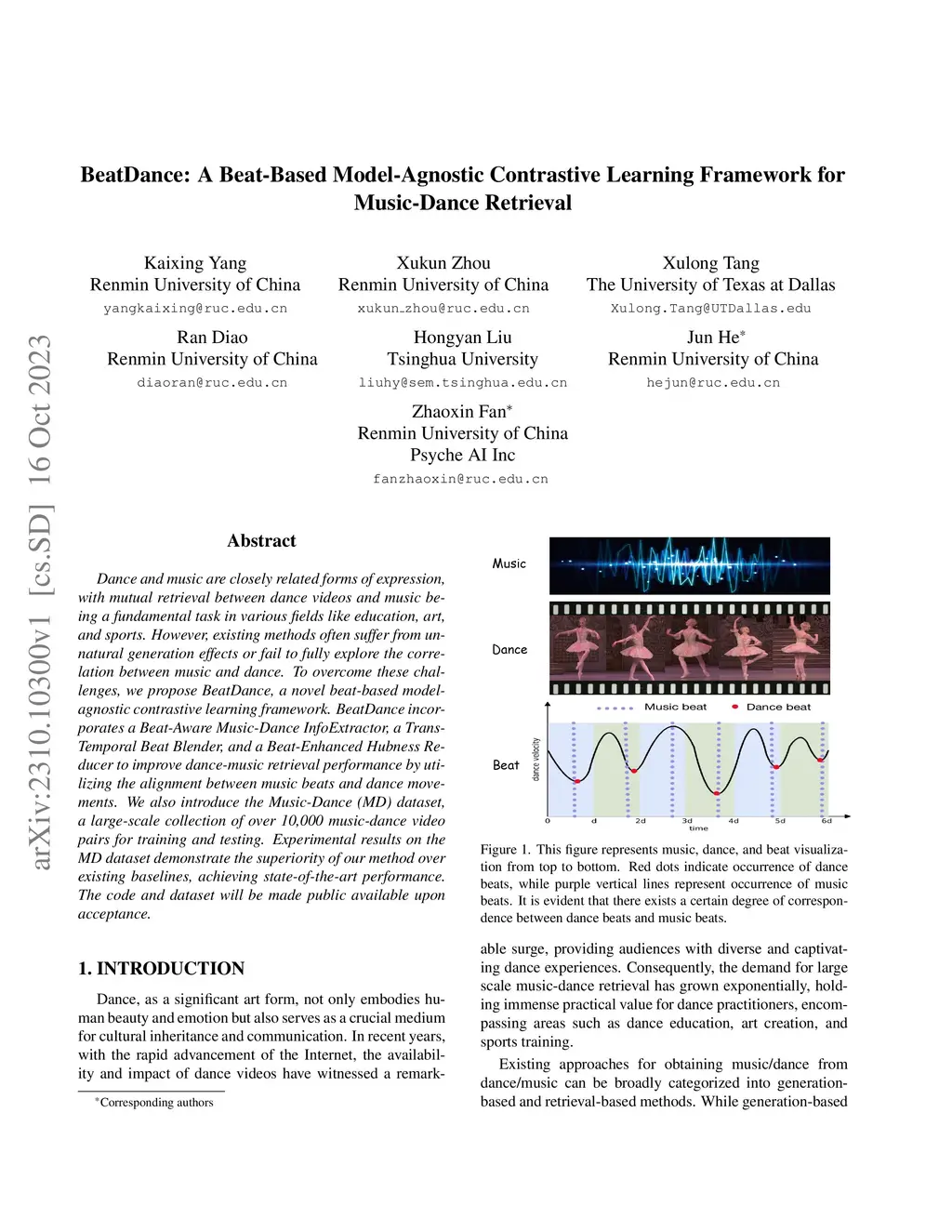 Dance and music are closely related forms of expression, with mutual retrieval between dance videos and music being a fundamental task in various fields like education, art, and sports. However, existing methods often suffer from unnatural generation effects or fail to fully explore the correlation between music and dance. To overcome these challenges, we propose BeatDance, a novel beat-based model-agnostic contrastive learning framework. BeatDance incorporates a Beat-Aware Music-Dance InfoExtractor, a Trans-Temporal Beat Blender, and a Beat-Enhanced Hubness Reducer to improve dance-music retrieval performance by utilizing the alignment between music beats and dance movements. We also introduce the Music-Dance (MD) dataset, a large-scale collection of over 10,000 music-dance video pairs for training and testing. Experimental results on the MD dataset demonstrate the superiority of our method over existing baselines, achieving state-of-the-art performance. The code and dataset will be made public available upon acceptance.