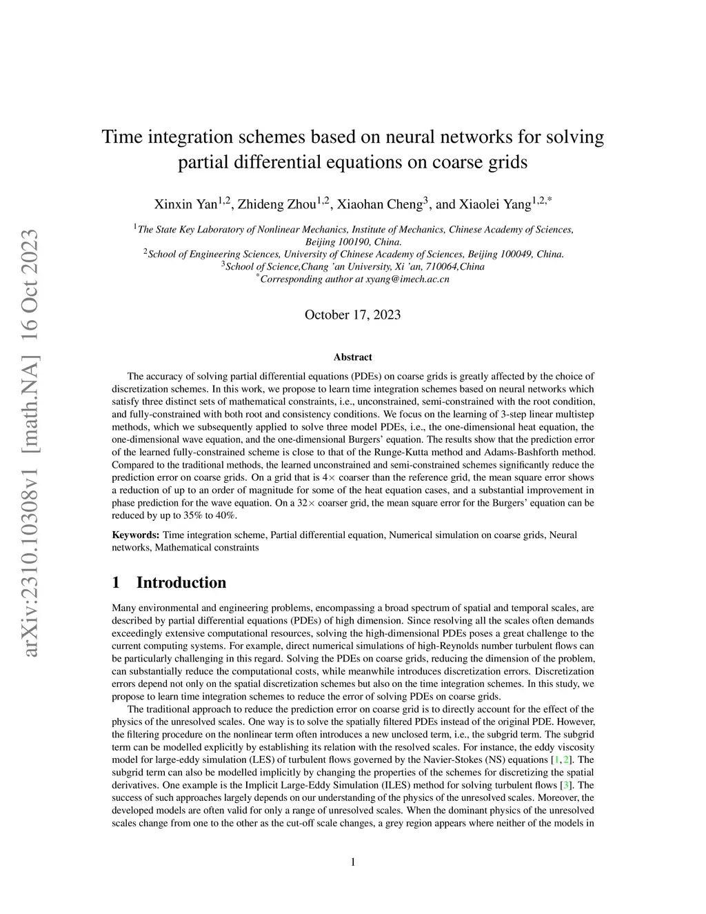The accuracy of solving partial differential equations (PDEs) on coarse grids is greatly affected by the choice of discretization schemes. In this work, we propose to learn time integration schemes based on neural networks which satisfy three distinct sets of mathematical constraints, i.e., unconstrained, semi-constrained with the root condition, and fully-constrained with both root and consistency conditions. We focus on the learning of 3-step linear multistep methods, which we subsequently applied to solve three model PDEs, i.e., the one-dimensional heat equation, the one-dimensional wave equation, and the one-dimensional Burgers' equation. The results show that the prediction error of the learned fully-constrained scheme is close to that of the Runge-Kutta method and Adams-Bashforth method. Compared to the traditional methods, the learned unconstrained and semi-constrained schemes significantly reduce the prediction error on coarse grids. On a grid that is 4 times coarser than the reference grid, the mean square error shows a reduction of up to an order of magnitude for some of the heat equation cases, and a substantial improvement in phase prediction for the wave equation. On a 32 times coarser grid, the mean square error for the Burgers' equation can be reduced by up to 35% to 40%.