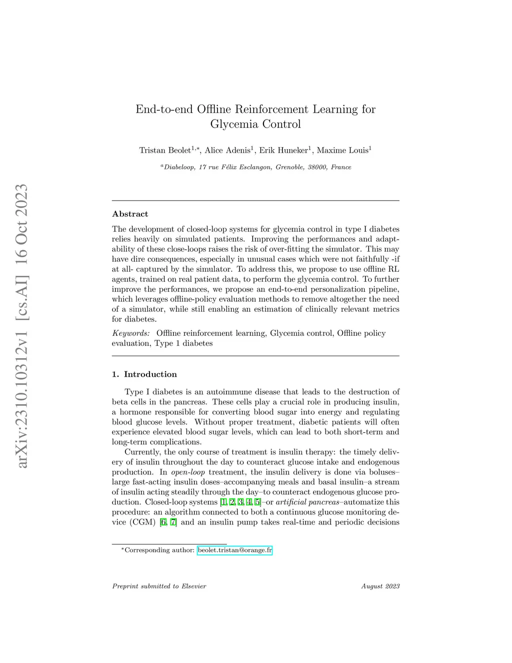 The development of closed-loop systems for glycemia control in type I diabetes relies heavily on simulated patients. Improving the performances and adaptability of these close-loops raises the risk of over-fitting the simulator. This may have dire consequences, especially in unusual cases which were not faithfully-if at all-captured by the simulator. To address this, we propose to use offline RL agents, trained on real patient data, to perform the glycemia control. To further improve the performances, we propose an end-to-end personalization pipeline, which leverages offline-policy evaluation methods to remove altogether the need of a simulator, while still enabling an estimation of clinically relevant metrics for diabetes.