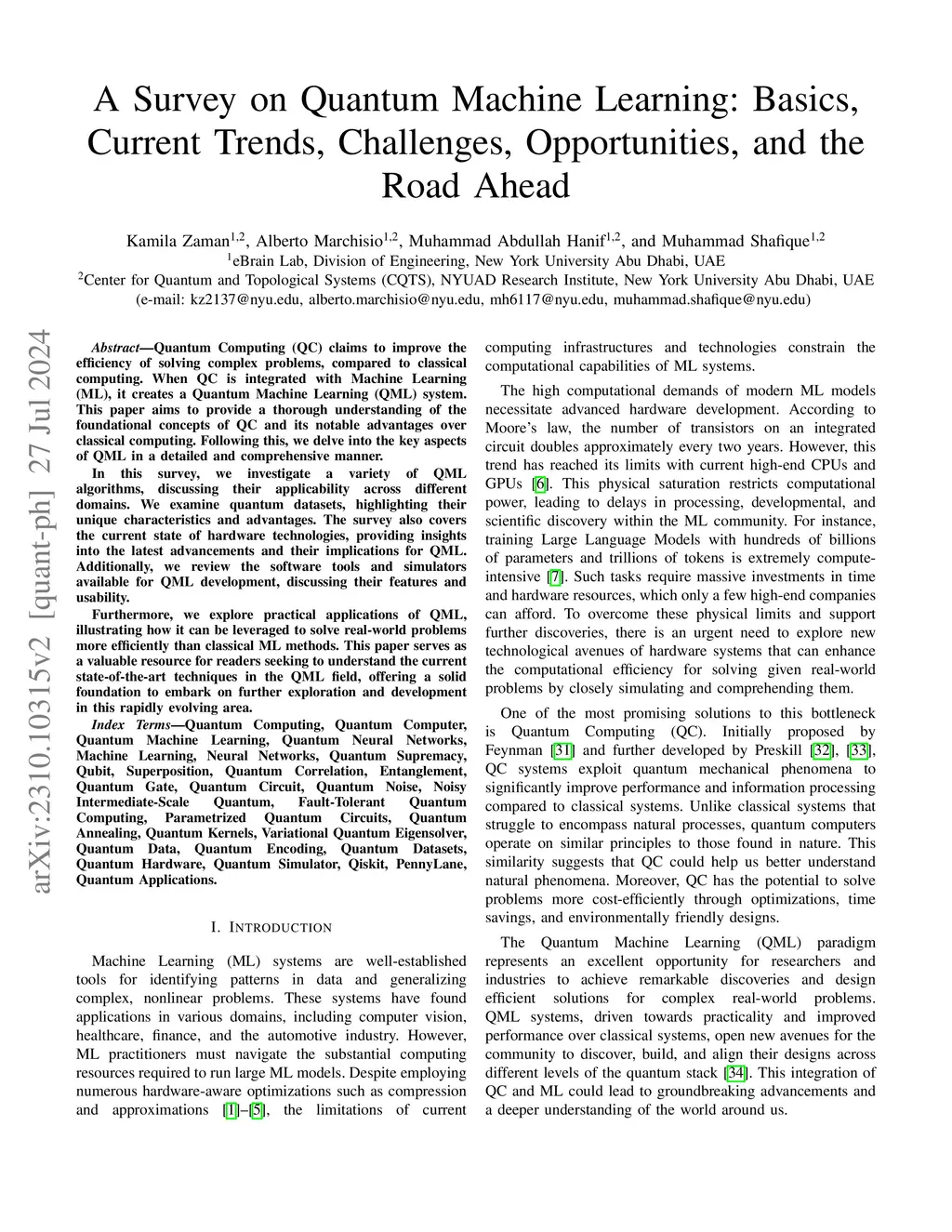 Quantum Computing (QC) claims to improve the efficiency of solving complex problems, compared to classical computing. When QC is integrated with Machine Learning (ML), it creates a Quantum Machine Learning (QML) system. This paper aims to provide a thorough understanding of the foundational concepts of QC and its notable advantages over classical computing. Following this, we delve into the key aspects of QML in a detailed and comprehensive manner.In this survey, we investigate a variety of QML algorithms, discussing their applicability across different domains. We examine quantum datasets, highlighting their unique characteristics and advantages. The survey also covers the current state of hardware technologies, providing insights into the latest advancements and their implications for QML. Additionally, we review the software tools and simulators available for QML development, discussing their features and usability.Furthermore, we explore practical applications of QML, illustrating how it can be leveraged to solve real-world problems more efficiently than classical ML methods. This survey aims to consolidate the current landscape of QML and outline key opportunities and challenges for future research.