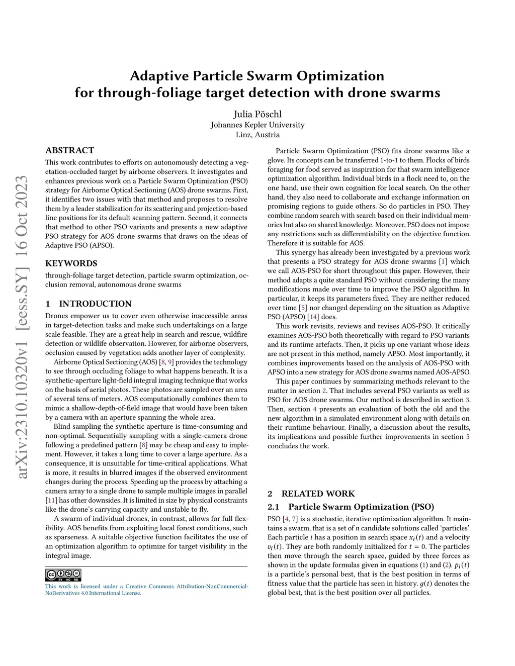 This work contributes to efforts on autonomously detecting a vegetation-occluded target by airborne observers. It investigates and enhances previous work on a Particle Swarm Optimization (PSO) strategy for Airborne Optical Sectioning (AOS) drone swarms. First, it identifies two issues with that method and proposes to resolve them by a leader stabilization for its scattering and projection-based line positions for its default scanning pattern. Second, it connects this method to other PSO variants and presents a new adaptive PSO strategy for AOS drone swarms that draws on the ideas of Adaptive PSO (APSO).