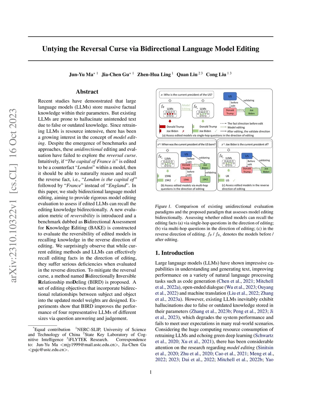 Recent studies have demonstrated that large language models (LLMs) store massive factual knowledge within their parameters. But existing LLMs are prone to hallucinate unintended text due to false or outdated knowledge. Since retraining LLMs is resource intensive, there has been a growing interest in the concept of model editing. Despite the emergence of benchmarks and approaches, these unidirectional editing and evaluation have failed to explore the reversal curse. Intuitively, if "The capital of France is" is edited to be a counterfact "London" within a model, then it should be able to naturally reason and recall the reverse fact, i.e., "London is the capital of" followed by "France" instead of "England". In this paper, we study bidirectional language model editing, aiming to provide rigorous model editing evaluation to assess if edited LLMs can recall the editing knowledge bidirectionally. A new evaluation metric of reversibility is introduced, and a benchmark dubbed as Bidirectional Assessment for Knowledge Editing (BAKE) is constructed to evaluate the reversibility of edited models in recalling knowledge in the reverse direction of editing. We surprisingly observe that while current editing methods and LLMs can effectively recall editing facts in the direction of editing, they suffer serious deficiencies when evaluated in the reverse direction. To mitigate the reversal curse, a method named Bidirectionally Inversible Relationship moDeling (BIRD) is proposed. A set of editing objectives that incorporate bidirectional relationships between subject and object into the updated model weights are designed. Experiments show that BIRD improves the performance of four representative LLMs of different sizes via question answering and judgement.