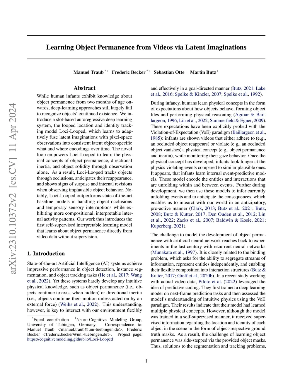 While human infants exhibit knowledge about object permanence from two months of age onwards, deep-learning approaches still largely fail to recognize objects' continued existence. We introduce a slot-based autoregressive deep learning system, the looped location and identity tracking model Loci-Looped, which learns to adaptively fuse latent imaginations with pixel-space observations into consistent latent object-specific what and where encodings over time. The novel loop empowers Loci-Looped to learn the physical concepts of object permanence, directional inertia, and object solidity through observation alone. As a result, Loci-Looped tracks objects through occlusions, anticipates their reappearance, and shows signs of surprise and internal revisions when observing implausible object behavior. Notably, Loci-Looped outperforms state-of-the-art baseline models in handling object occlusions and temporary sensory interruptions while exhibiting more compositional, interpretable internal activity patterns. Our work thus introduces the first self-supervised interpretable learning model that learns about object permanence directly from video data without supervision.
