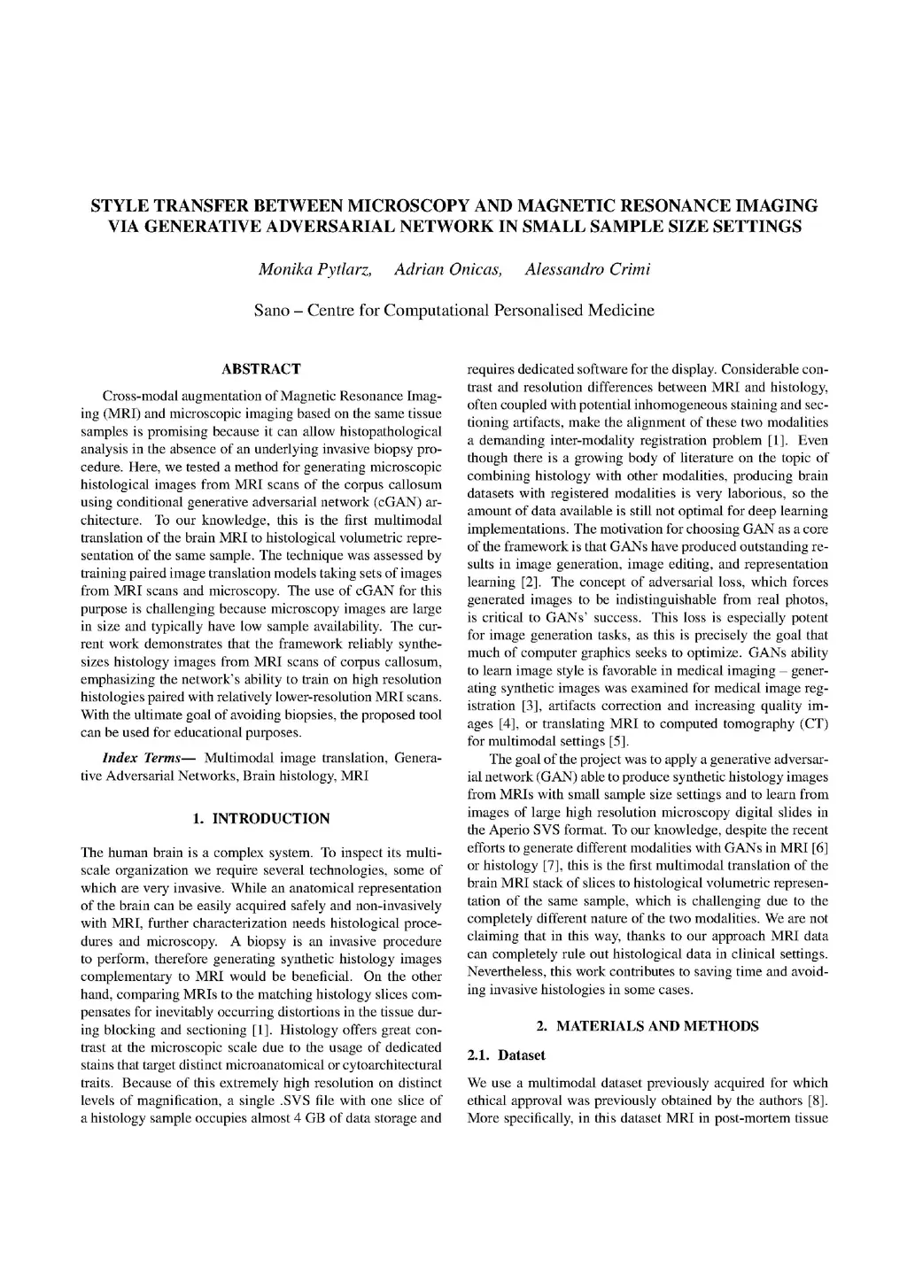 Style transfer between Microscopy and Magnetic Resonance Imaging via Generative Adversarial Network in small sample size settings