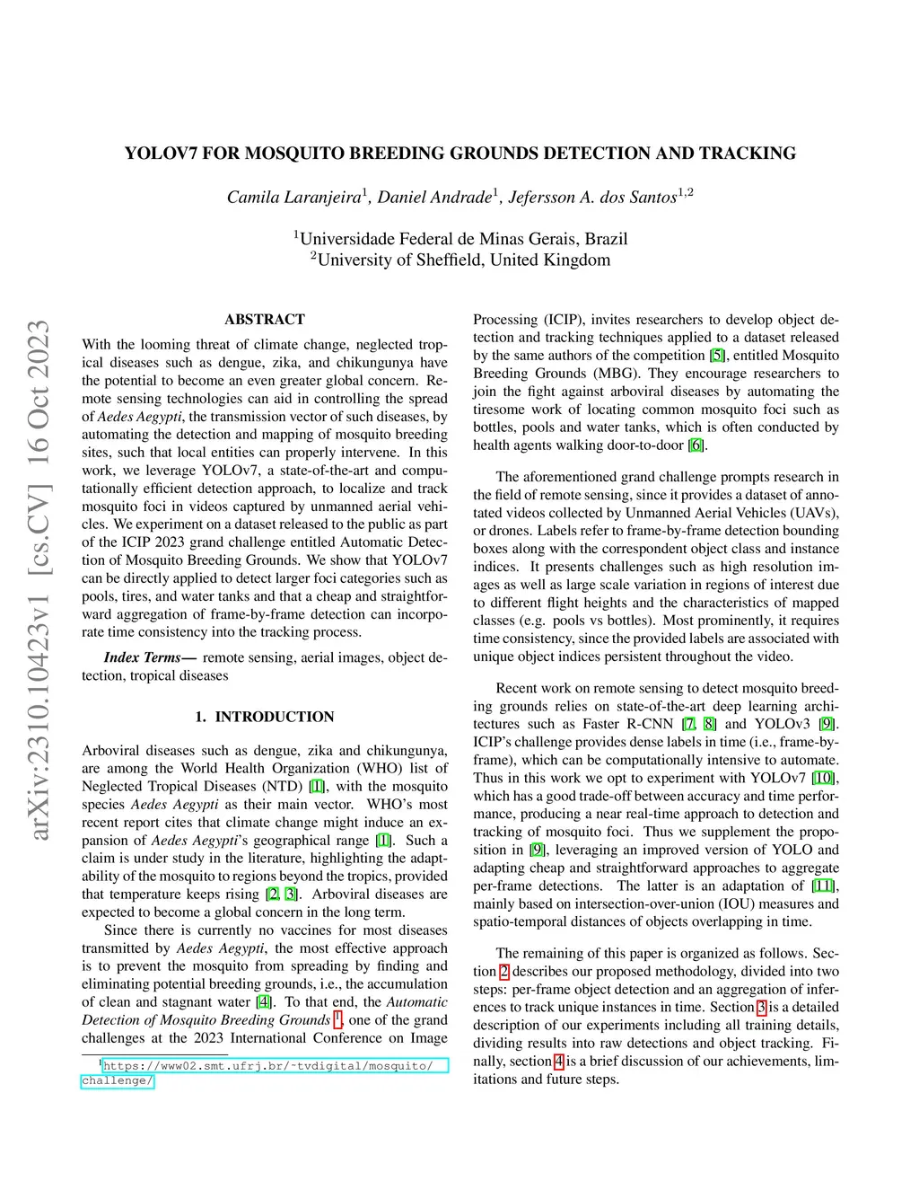 With the looming threat of climate change, neglected tropical diseases such as dengue, zika, and chikungunya have the potential to become an even greater global concern. Remote sensing technologies can aid in controlling the spread of Aedes Aegypti, the transmission vector of such diseases, by automating the detection and mapping of mosquito breeding sites, such that local entities can properly intervene. In this work, we leverage YOLOv7, a state-of-the-art and computationally efficient detection approach, to localize and track mosquito foci in videos captured by unmanned aerial vehicles. We experiment on a dataset released to the public as part of the ICIP 2023 grand challenge entitled Automatic Detection of Mosquito Breeding Grounds. We show that YOLOv7 can be directly applied to detect larger foci categories such as pools, tires, and water tanks and that a cheap and straightforward aggregation of frame-by-frame detection can incorporate time consistency into the tracking process.