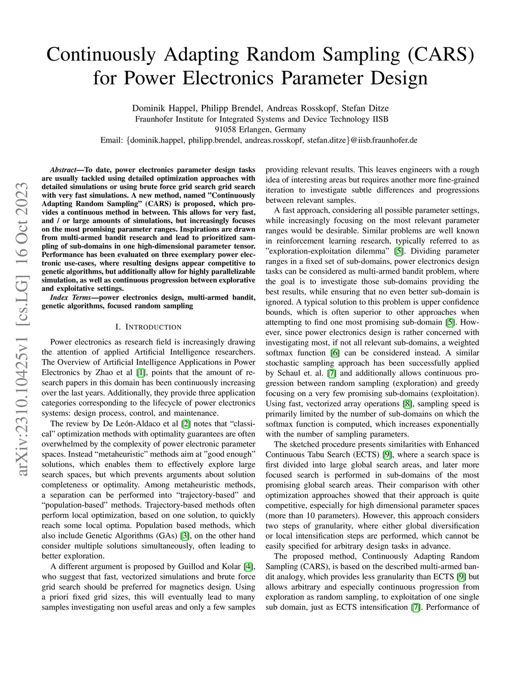 To date, power electronics parameter design tasks are usually tackled using detailed optimization approaches with detailed simulations or using brute force grid search grid search with very fast simulations. A new method, named "Continuously Adapting Random Sampling" (CARS) is proposed, which provides a continuous method in between. This allows for very fast, and / or large amounts of simulations, but increasingly focuses on the most promising parameter ranges. Inspirations are drawn from multi-armed bandit research and lead to prioritized sampling of sub-domains in one high-dimensional parameter tensor. Performance has been evaluated on three exemplary power electronic use-cases, where resulting designs appear competitive to genetic algorithms, but additionally allow for highly parallelizable simulation, as well as continuous progression between explorative and exploitative settings.