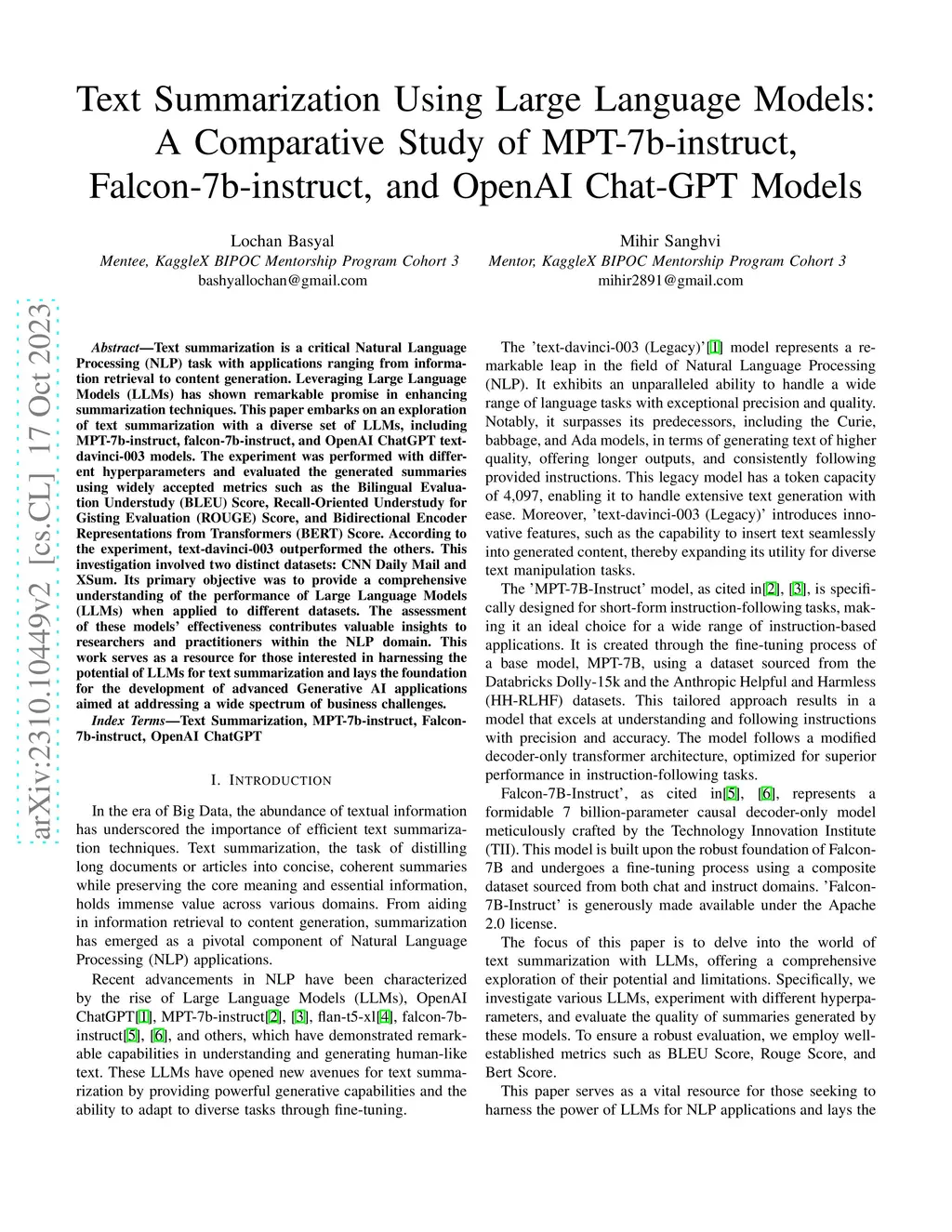Text summarization is a critical Natural Language Processing (NLP) task with applications ranging from information retrieval to content generation. Leveraging Large Language Models (LLMs) has shown remarkable promise in enhancing summarization techniques. This paper embarks on an exploration of text summarization with a diverse set of LLMs, including MPT-7b-instruct, falcon-7b-instruct, and OpenAI ChatGPT text-davinci-003 models. The experiment was performed with different hyperparameters and evaluated the generated summaries using widely accepted metrics such as the Bilingual Evaluation Understudy (BLEU) Score, Recall-Oriented Understudy for Gisting Evaluation (ROUGE) Score, and Bidirectional Encoder Representations from Transformers (BERT) Score. According to the experiment, text-davinci-003 outperformed the others. This investigation involved two distinct datasets: CNN Daily Mail and XSum. Its primary objective was to provide a comprehensive understanding of the performance of Large Language Models (LLMs) when applied to different datasets. The assessment of these models' effectiveness contributes valuable insights to researchers and practitioners within the NLP domain. This work serves as a resource for those interested in harnessing the potential of LLMs for text summarization and lays the foundation for the development of advanced Generative AI applications aimed at addressing a wide spectrum of business challenges.