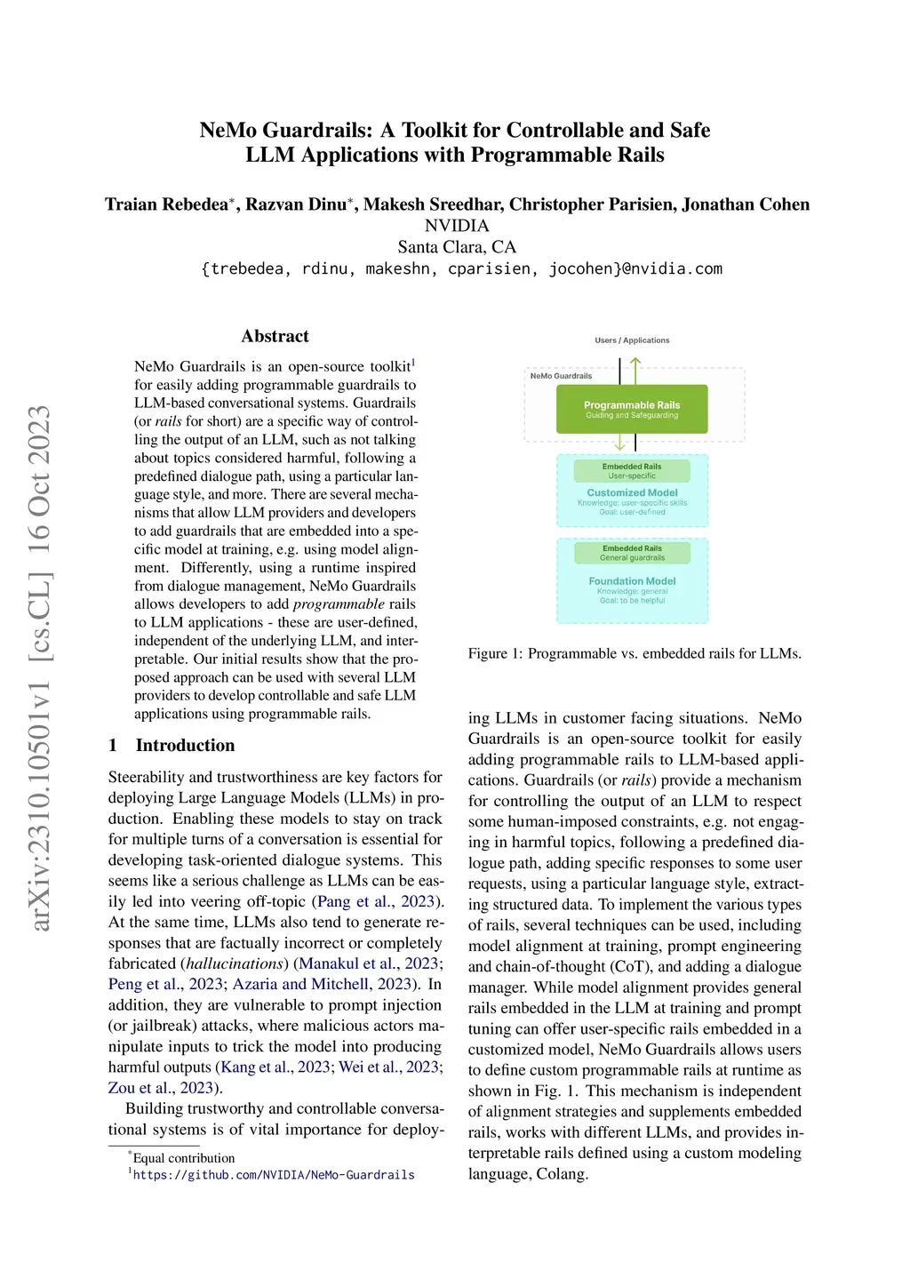 NeMo Guardrails: A Toolkit for Controllable and Safe LLM Applications