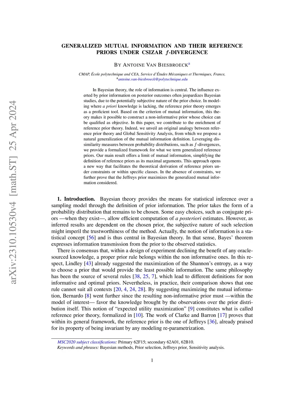 In Bayesian theory, the role of information is central. The influence exerted by prior information on posterior outcomes often jeopardizes Bayesian studies, due to the potentially subjective nature of the prior choice. When the studied model is not enriched with sufficiently a priori information, the reference prior theory emerges as a proficient tool. Based on the mutual information criterion, the theory handles the construction of a non informative prior whose choice could be called objective. We unveil an original analogy between reference prior theory and Global Sensitivity Analysis, from which we propose a natural generalization of the mutual information definition. A class of our generalized metrics is studied and our results reinforce the Jeffreys' prior choice which satisfies our extended definition of reference prior.