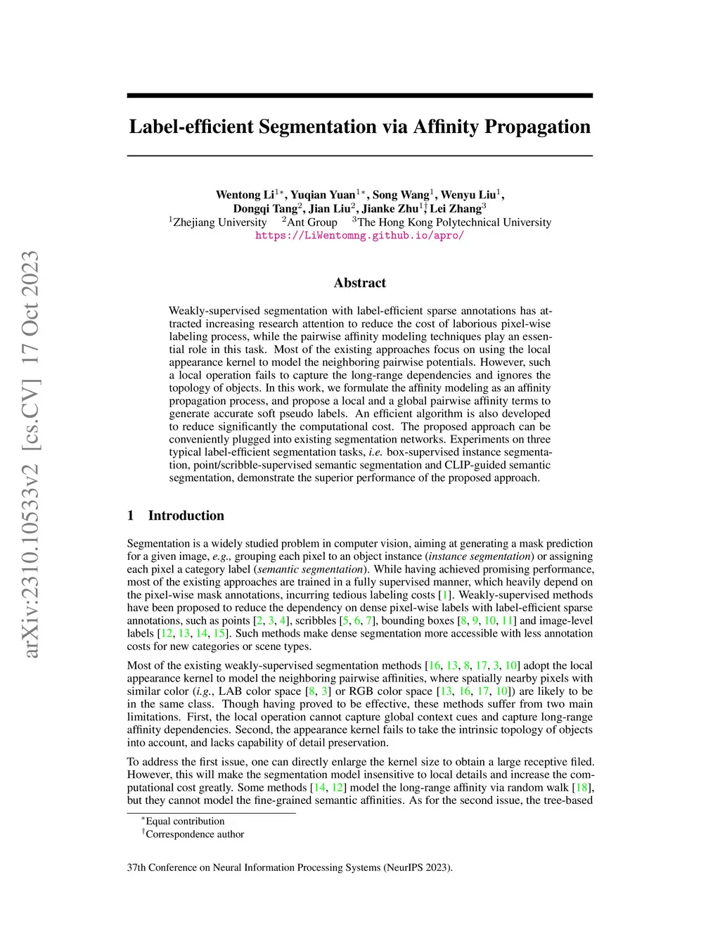Label-efficient Segmentation via Affinity Propagation