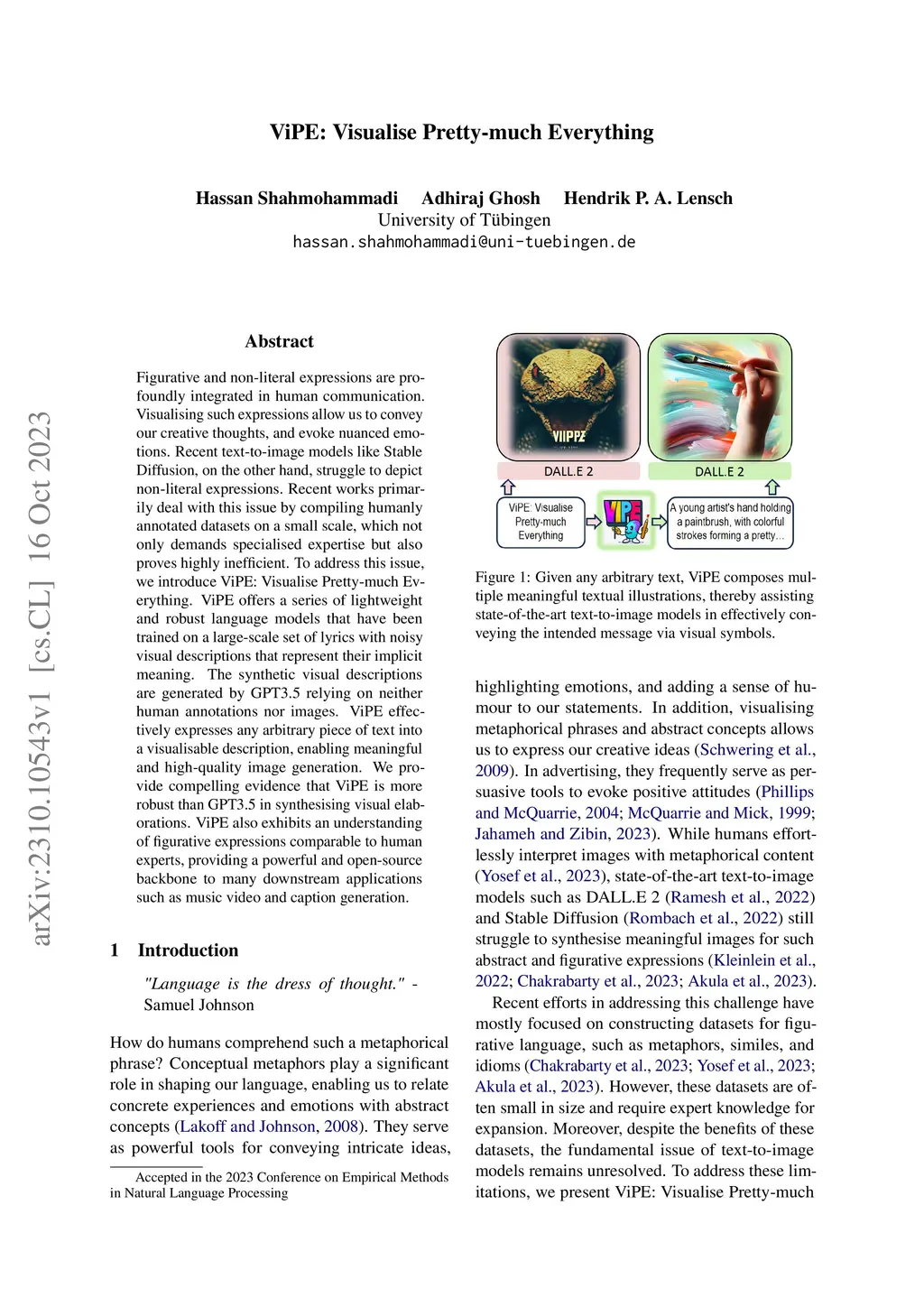 Figurative and non-literal expressions are profoundly integrated in human communication. Visualising such expressions allow us to convey our creative thoughts, and evoke nuanced emotions. Recent text-to-image models like Stable Diffusion, on the other hand, struggle to depict non-literal expressions. Recent works primarily deal with this issue by compiling humanly annotated datasets on a small scale, which not only demands specialised expertise but also proves highly inefficient. To address this issue, we introduce ViPE: Visualise Pretty-much Everything. ViPE offers a series of lightweight and robust language models that have been trained on a large-scale set of lyrics with noisy visual descriptions that represent their implicit meaning. The synthetic visual descriptions are generated by GPT3.5 relying on neither human annotations nor images. ViPE effectively expresses any arbitrary piece of text into a visualisable description, enabling meaningful and high-quality image generation. We provide compelling evidence that ViPE is more robust than GPT3.5 in synthesising visual elaborations. ViPE also exhibits an understanding of figurative expressions comparable to human experts, providing a powerful and open-source backbone to many downstream applications such as music video and caption generation.