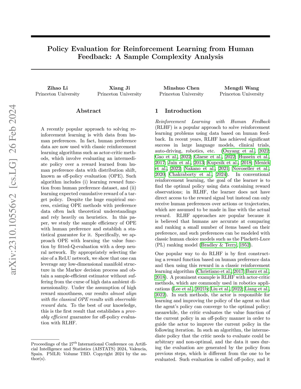 A recently popular approach to solving reinforcement learning is with data from human preferences. In fact, human preference data are now used with classic reinforcement learning algorithms such as actor-critic methods, which involve evaluating an intermediate policy over a reward learned from human preference data with distribution shift, known as off-policy evaluation (OPE). Such algorithm includes (i) learning reward function from human preference dataset, and (ii) learning expected cumulative reward of a target policy. Despite the huge empirical success, existing OPE methods with preference data often lack theoretical understanding and rely heavily on heuristics. In this paper, we study the sample efficiency of OPE with human preference and establish a statistical guarantee for it. Specifically, we approach OPE by learning the value function by fitted-Q-evaluation with a deep neural network. By appropriately selecting the size of a ReLU network, we show that one can leverage any low-dimensional manifold structure in the Markov decision process and obtain a sample-efficient estimator without suffering from the curse of high data ambient dimensionality. Under the assumption of high reward smoothness, our results \textit{almost align with the classical OPE results with observable reward data}. To the best of our knowledge, this is the first result that establishes a \textit{provably efficient} guarantee for off-policy evaluation with RLHF.