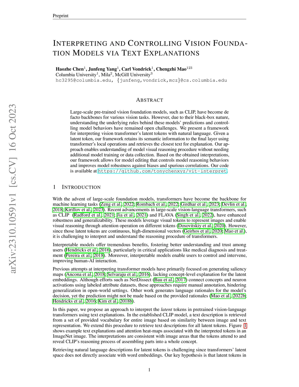 Large-scale pre-trained vision foundation models, such as CLIP, have become de facto backbones for various vision tasks. However, due to their black-box nature, understanding the underlying rules behind these models' predictions and controlling model behaviors have remained open challenges. We present a framework for interpreting vision transformer's latent tokens with natural language. Given a latent token, our framework retains its semantic information to the final layer using transformer's local operations and retrieves the closest text for explanation. Our approach enables understanding of model visual reasoning procedure without needing additional model training or data collection. Based on the obtained interpretations, our framework allows for model editing that controls model reasoning behaviors and improves model robustness against biases and spurious correlations.