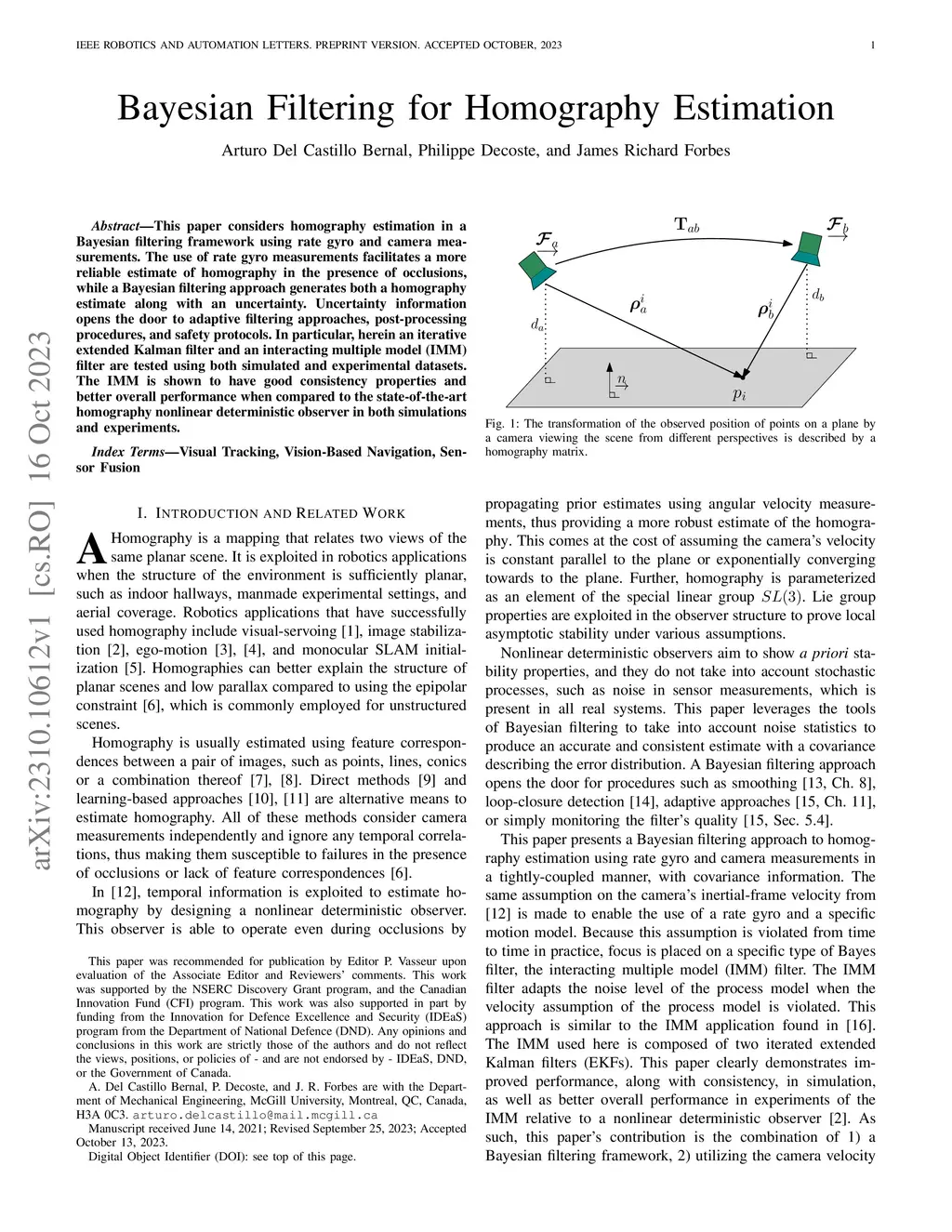 This paper considers homography estimation in a Bayesian filtering framework using rate gyro and camera measurements. The use of rate gyro measurements facilitates a more reliable estimate of homography in the presence of occlusions, while a Bayesian filtering approach generates both a homography estimate along with an uncertainty. Uncertainty information opens the door to adaptive filtering approaches, post-processing procedures, and safety protocols. In particular, herein an iterative extended Kalman filter and an interacting multiple model (IMM) filter are tested using both simulated and experimental datasets. The IMM is shown to have good consistency properties and better overall performance when compared to the state-of-the-art homography nonlinear deterministic observer in both simulations and experiments.