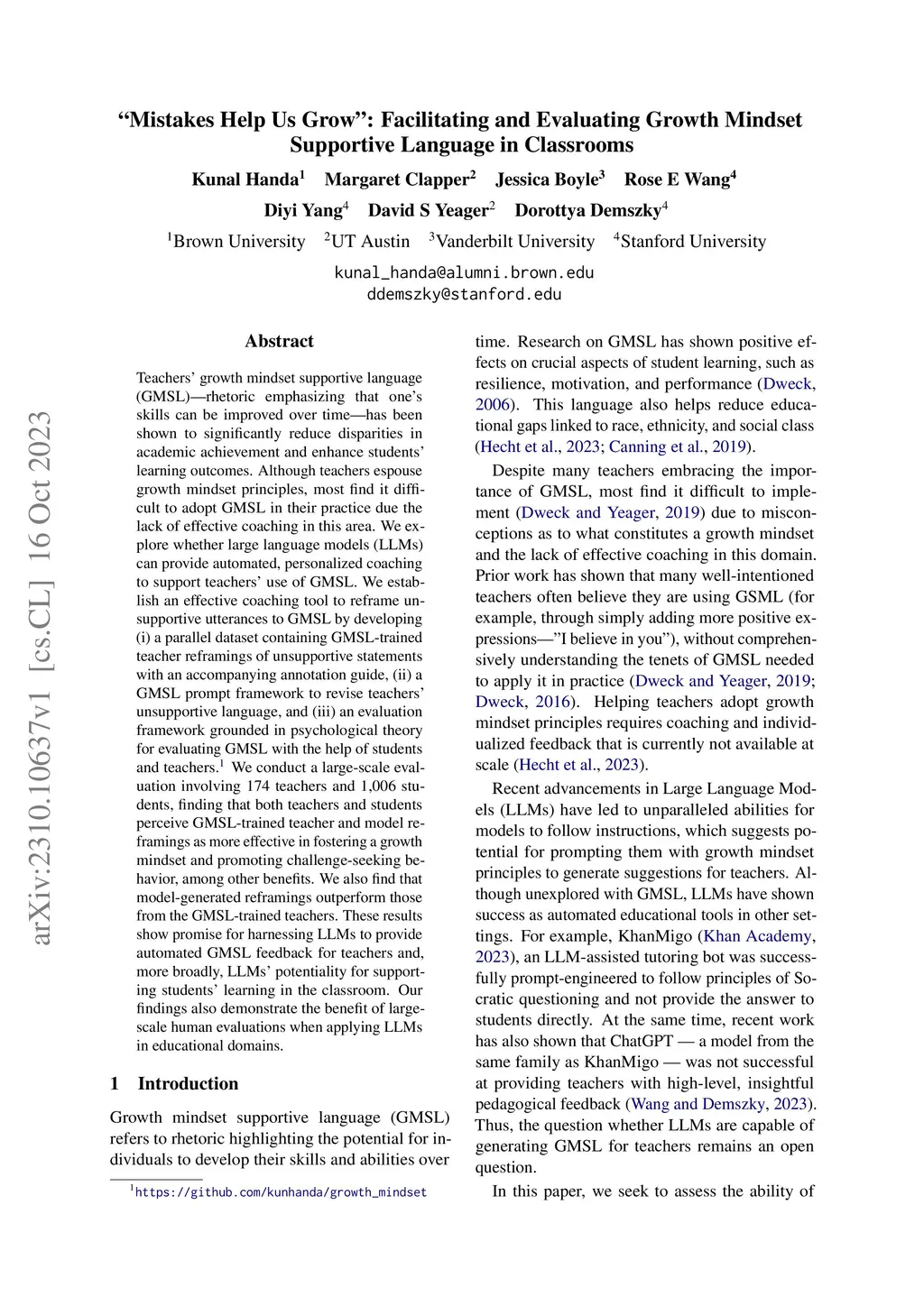 Teachers' growth mindset supportive language (GMSL)--rhetoric emphasizing that one's skills can be improved over time--has been shown to significantly reduce disparities in academic achievement and enhance students' learning outcomes. Although teachers espouse growth mindset principles, most find it difficult to adopt GMSL in their practice due the lack of effective coaching in this area. We explore whether large language models (LLMs) can provide automated, personalized coaching to support teachers' use of GMSL. We establish an effective coaching tool to reframe unsupportive utterances to GMSL by developing (i) a parallel dataset containing GMSL-trained teacher reframings of unsupportive statements with an accompanying annotation guide, (ii) a GMSL prompt framework to revise teachers' unsupportive language, and (iii) an evaluation framework grounded in psychological theory for evaluating GMSL with the help of students and teachers. We conduct a large-scale evaluation involving 174 teachers and 1,006 students, finding that both teachers and students perceive GMSL-trained teacher and model reframings as more effective in fostering a growth mindset and promoting challenge-seeking behavior, among other benefits. We also find that model-generated reframings outperform those from the GMSL-trained teachers. These results show promise for harnessing LLMs to provide automated GMSL feedback for teachers and, more broadly, LLMs' potentiality for supporting students' learning in the classroom. Our findings also demonstrate the benefit of large-scale human evaluations when applying LLMs in educational domains.