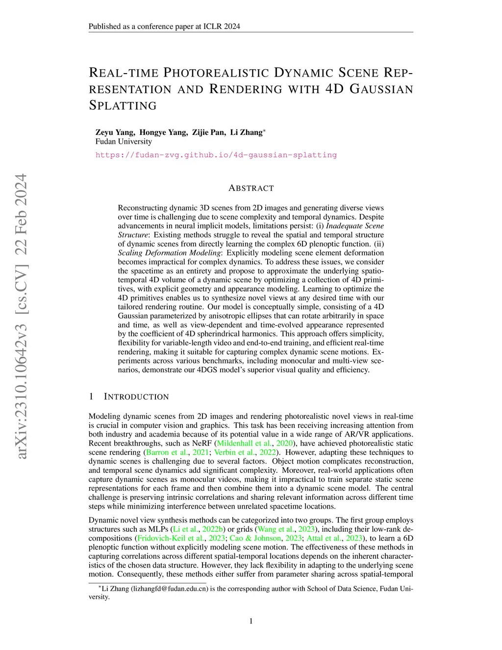 Reconstructing dynamic 3D scenes from 2D images and generating diverse views over time is challenging due to scene complexity and temporal dynamics. Despite advancements in neural implicit models, limitations persist: (i) Inadequate Scene Structure: Existing methods struggle to reveal the spatial and temporal structure of dynamic scenes from directly learning the complex 6D plenoptic function. (ii) Scaling Deformation Modeling: Explicitly modeling scene element deformation becomes impractical for complex dynamics. To address these issues, we consider the spacetime as an entirety and propose to approximate the underlying spatio-temporal 4D volume of a dynamic scene by optimizing a collection of 4D primitives, with explicit geometry and appearance modeling. Learning to optimize the 4D primitives enables us to synthesize novel views at any desired time with our tailored rendering routine. Our model is conceptually simple, consisting of a 4D Gaussian parameterized by anisotropic ellipses that can rotate arbitrarily in space and time, as well as view-dependent and time-evolved appearance represented by the coefficient of 4D spherindrical harmonics. This approach offers simplicity, flexibility for variable-length video and end-to-end training, and efficient real-time rendering, making it suitable for capturing complex dynamic scene motions. Experiments across various benchmarks, including monocular and multi-view scenarios, demonstrate our 4DGS model's superior visual quality and efficiency.